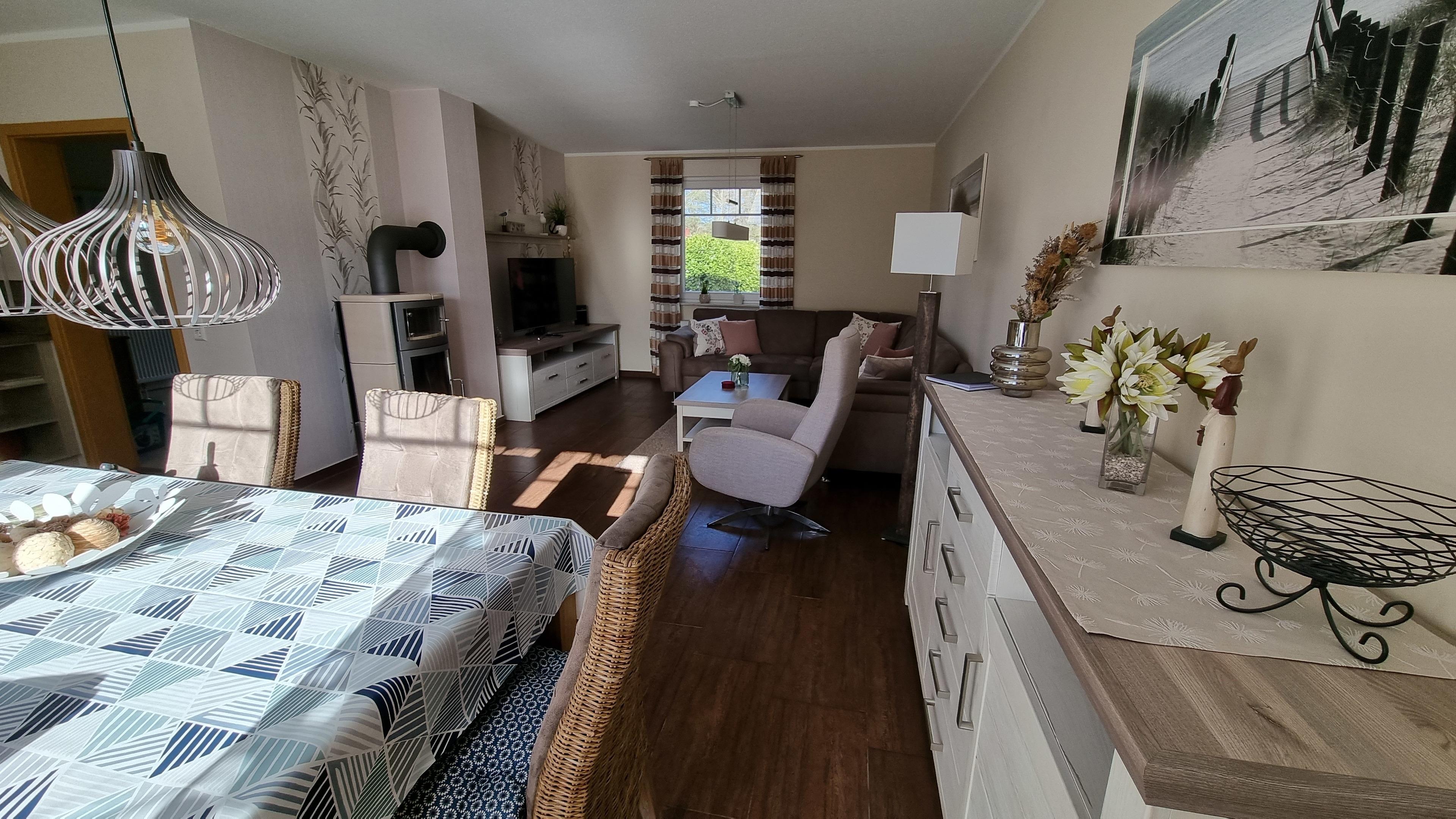 Ein gemütlich eingerichtetes Wohnzimmer mit Kaminofen und der beheizte Wintergarten laden auch im Winter zum Erholen ein.