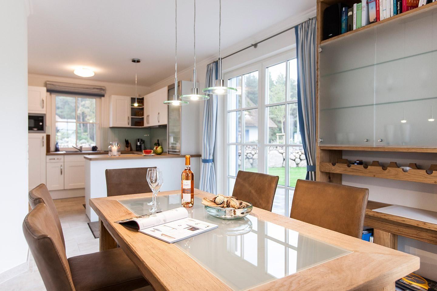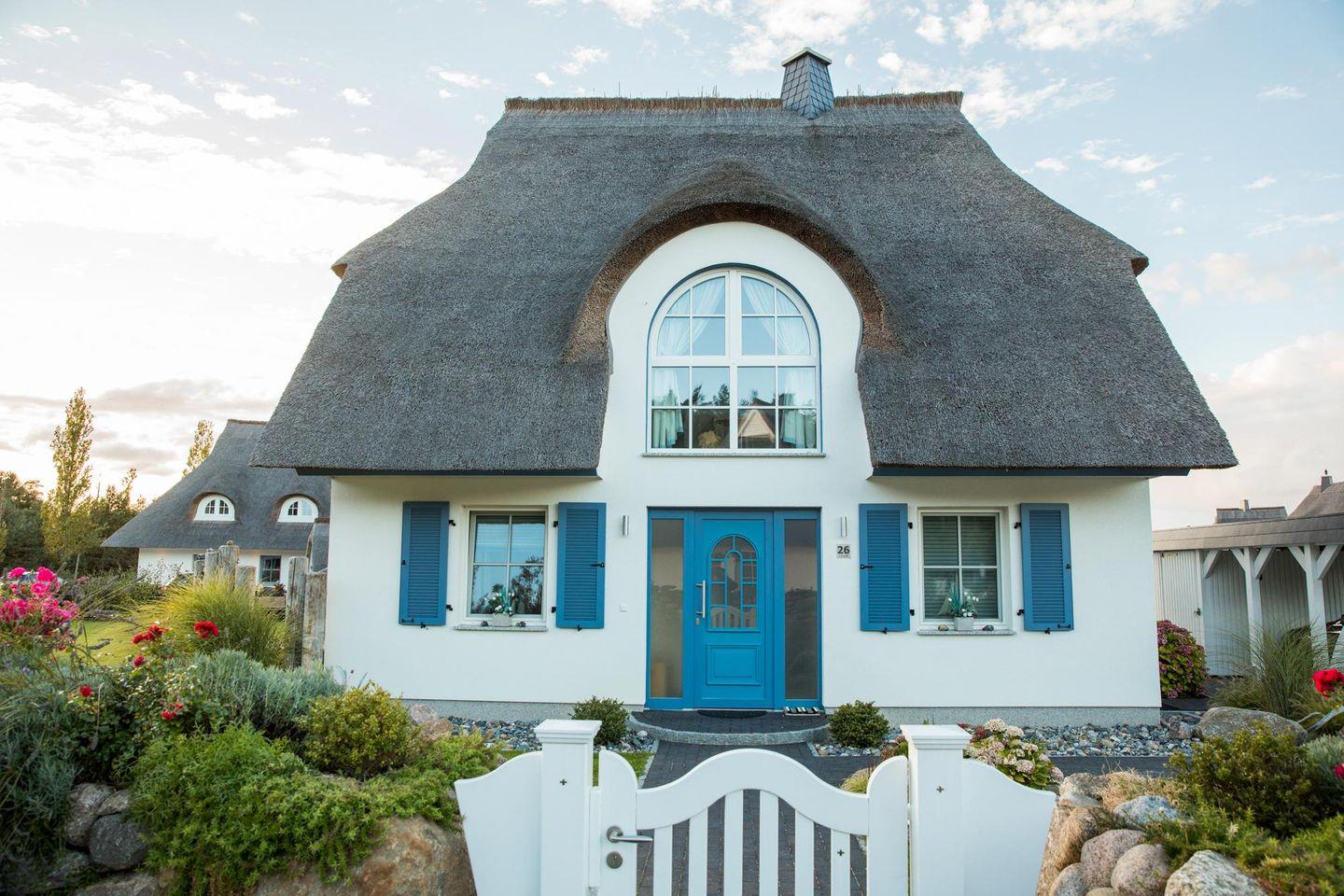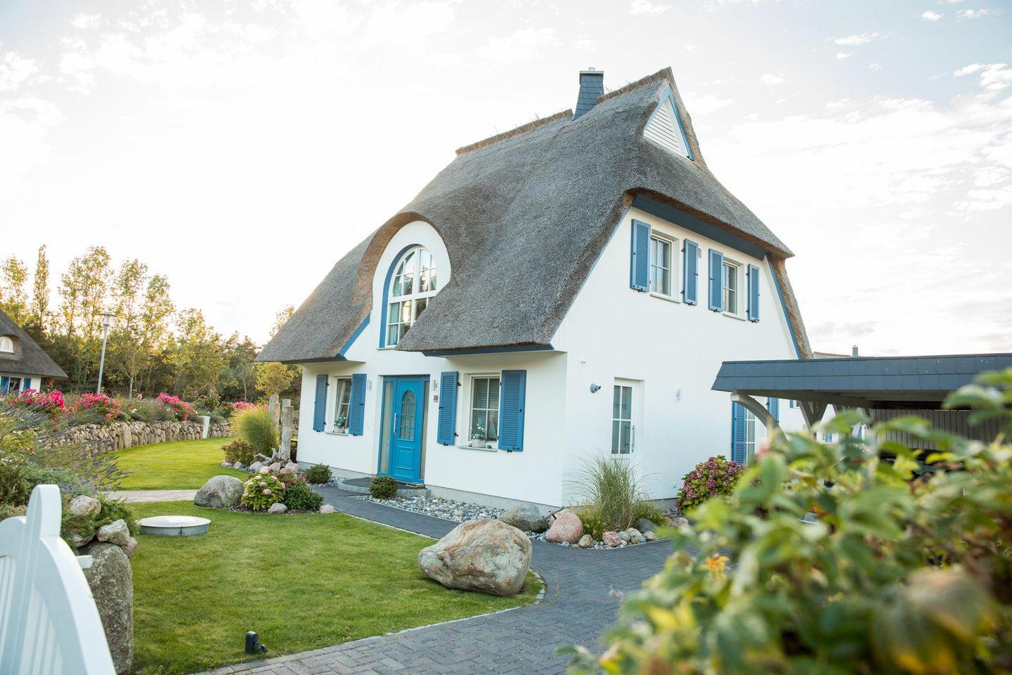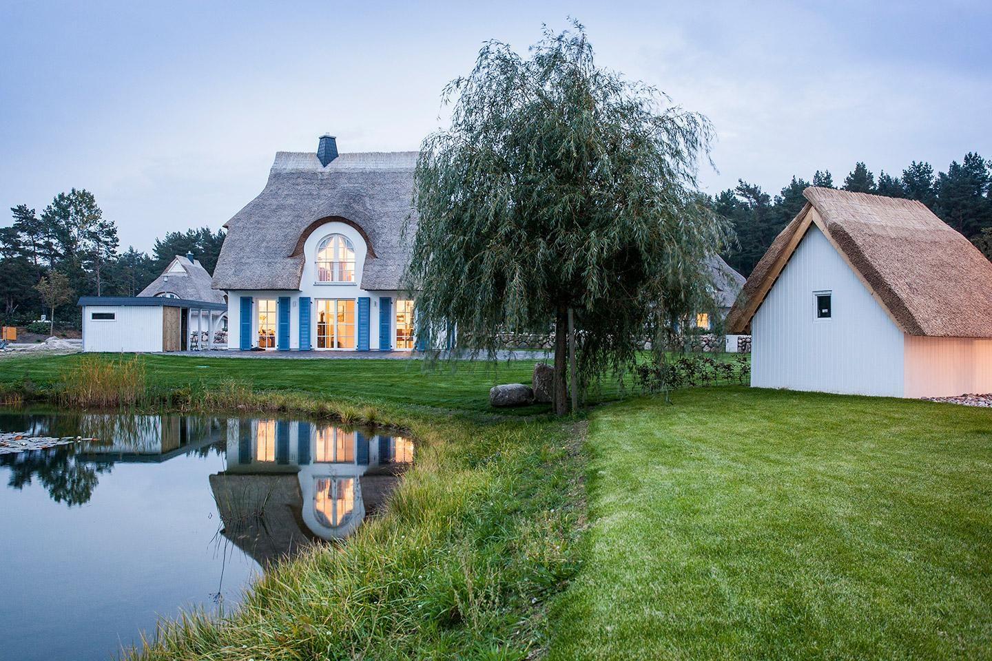 Das wunderschöne Ferienhaus mit traditionellem Reetdach, Fensterläden, ortstypischer Feldsteineinfriedung und 882 m2 großem Grundstück am Teich liegt in einer neuen Ferienhausanlage. Es bietet großzügig Platz für vier Feriengäste (zwei Schlafzimmer mit Doppelbett) und verfügt über ein Duschbad mit WC und Sauna und ein Wannenbad mit WC im OG sowie ein Gäste-WC im EG.
