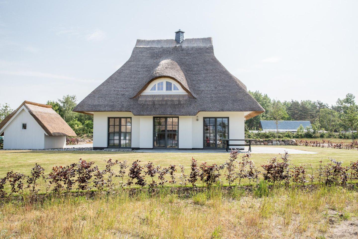 Dieses wunderschöne Ferienhaus mit traditionellem Reetdach, ortstypischer Feldsteineinfriedung und 836 m2 großem Grundstück am Teich liegt in einer neuen Ferienhausanlage. Es bietet großzügig Platz für sechs Feriengäste (drei Schlafzimmer mit Doppelbett, davon eins im EG) und verfügt über zwei hochwertige Bäder und ein Gäste-WC, davon ein Bad mit Badewanne und Dusche, ein Bad mit Dusche und Sauna.