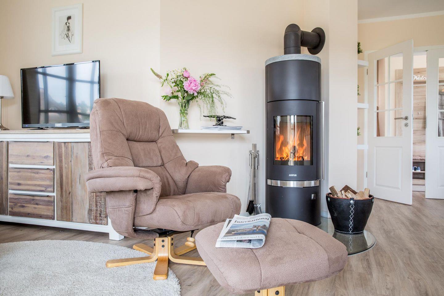 Im Erdgeschoss befindet sich ein ca. 30 qm großer Wohn-Essbereich mit gemütlichen Sitzmöglichkeiten, Kaminofen, SAT-TV mit Sky und neben einer komplett ausgestatteten Küche ist ein großer Esstisch für sechs Personen vorhanden. In dem Hauswirtschaftsraum befinden sich u.a. Waschmaschine, Bügeleisen und Bügelbrett.