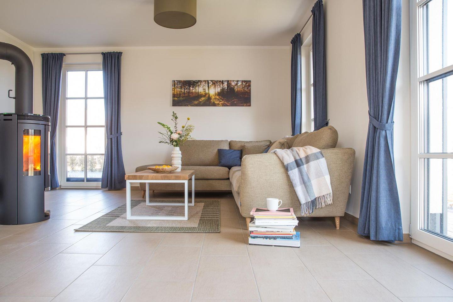 Im EG befindet sich ein ca. 30 qm großer Wohn-Essbereich mit gemütlicher Couchecke, Kaminofen, SAT-TV mit Sky und neben einer komplett ausgestatteten Küche ist ein Esstisch für 6 Personen vorhanden. Die großzügige Terrasse bietet einen herrlichen Blick auf den Teich und viel Morgen- und Abendsonne.