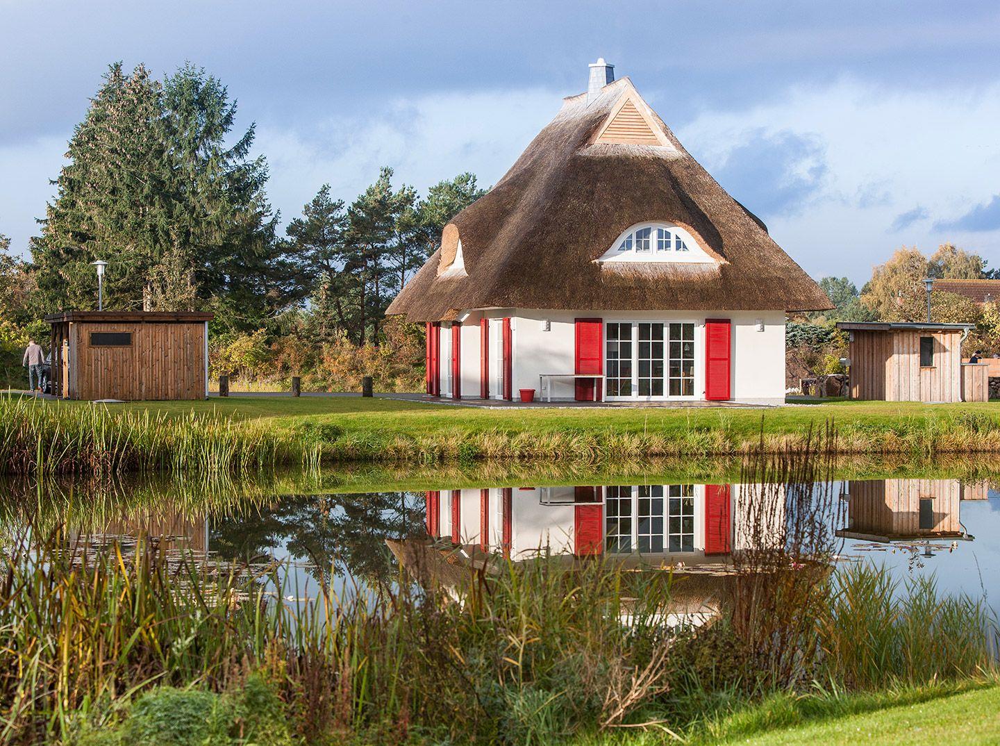 Dieses wunderschöne Ferienhaus mit traditionellem Reetdach, Fensterläden und ca. 500 m2 großem Grundstück am Teich liegt in einer neuen Ferienhausanlage. Es bietet großzügig Platz für sechs Feriengäste (drei Schlafzimmer mit Doppelbett, davon eins im EG) und verfügt über zwei hochwertige Bäder und ein Gäste-WC, davon ein Bad mit Badewanne und Dusche, ein Bad mit Dusche und Sauna.