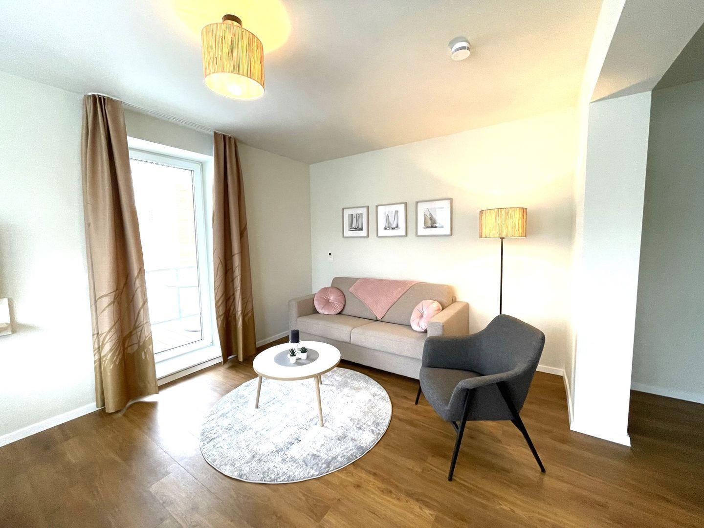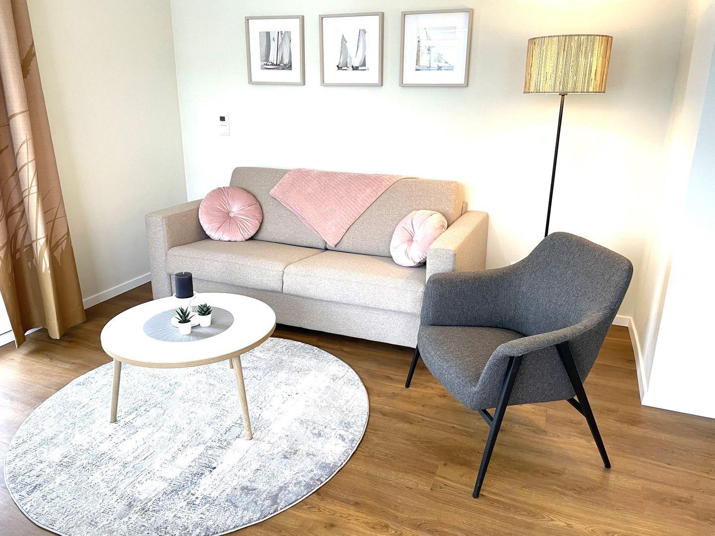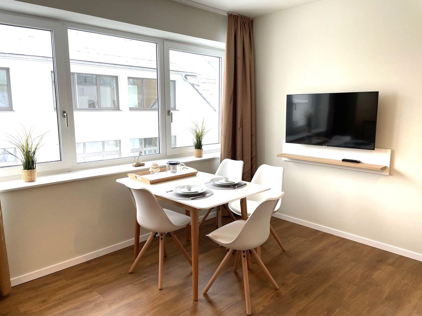 Das komfortable Appartement bietet auf 51 qm viel Platz für bis zu 4 Personen. Der gemütliche Wohnbereich besitzt ein bequemes Sofa, welches sich mit wenigen Handgriffen zu einer Doppelschlafcouch (1,40m x 2,00m) umfunktionieren lässt, und sorgt mit einem Flat Screen-TV für reichlich Entertainment.