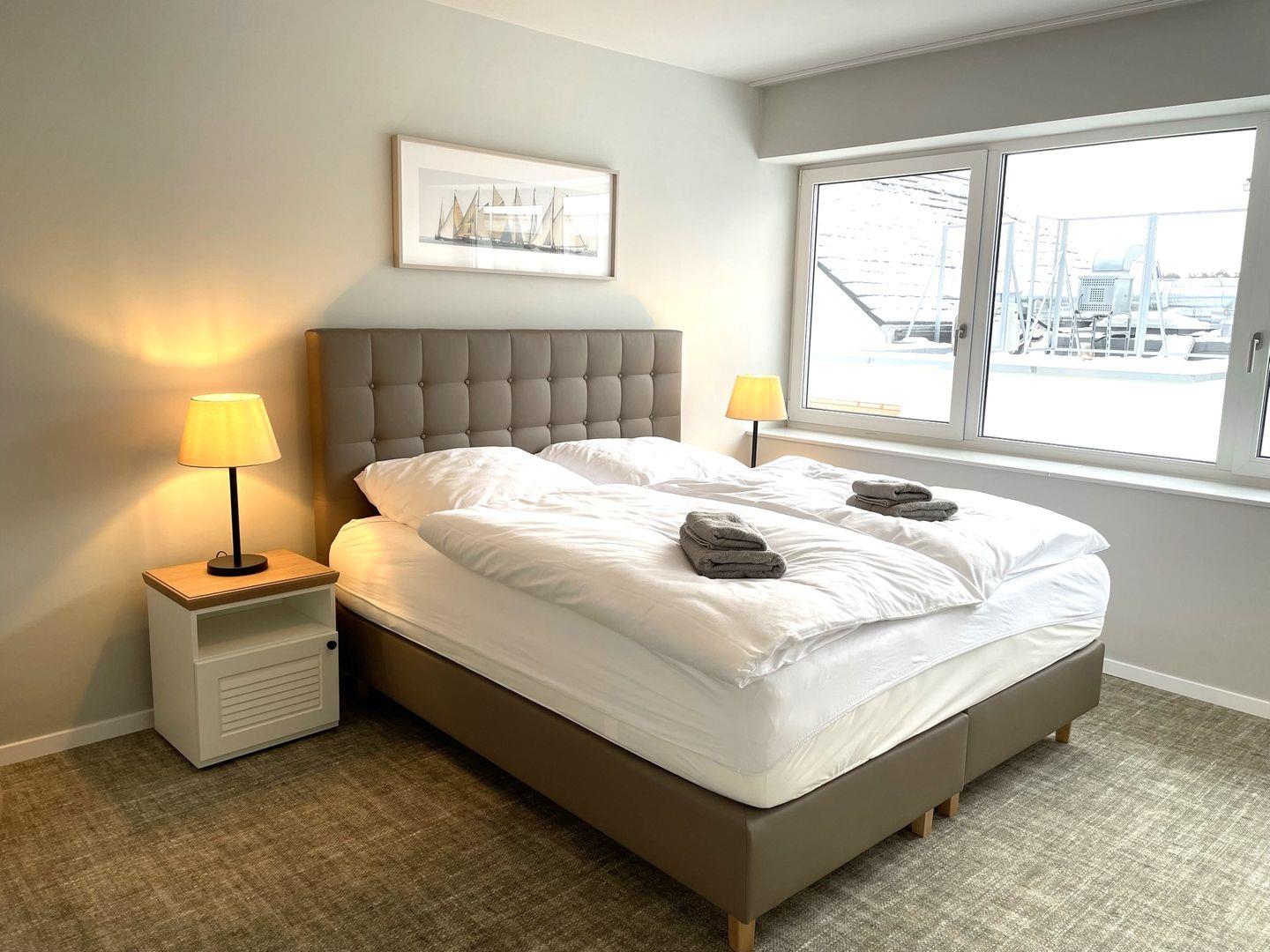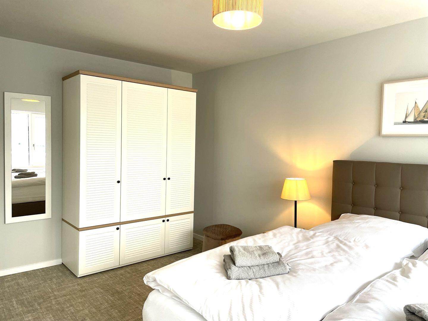 Das Schlafzimmer bietet ein modernes Doppelbett (1,80m x 2,00m), auf welchem Sie süße Träume haben werden. Ein Kinderbett sowie ein Hochstuhl können auf Anfrage hinzugebucht werden.