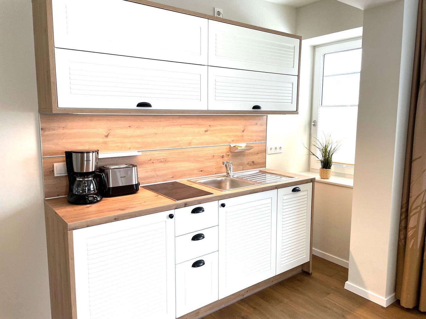 Die offene Pantryküche mit anliegendem Essbereich bieten Ihnen einen Geschirrspüler, Kühlschrank mit Gefrierfach, Kaffeemaschine, 2-Platten-Ceranfeld und Wasserkocher.