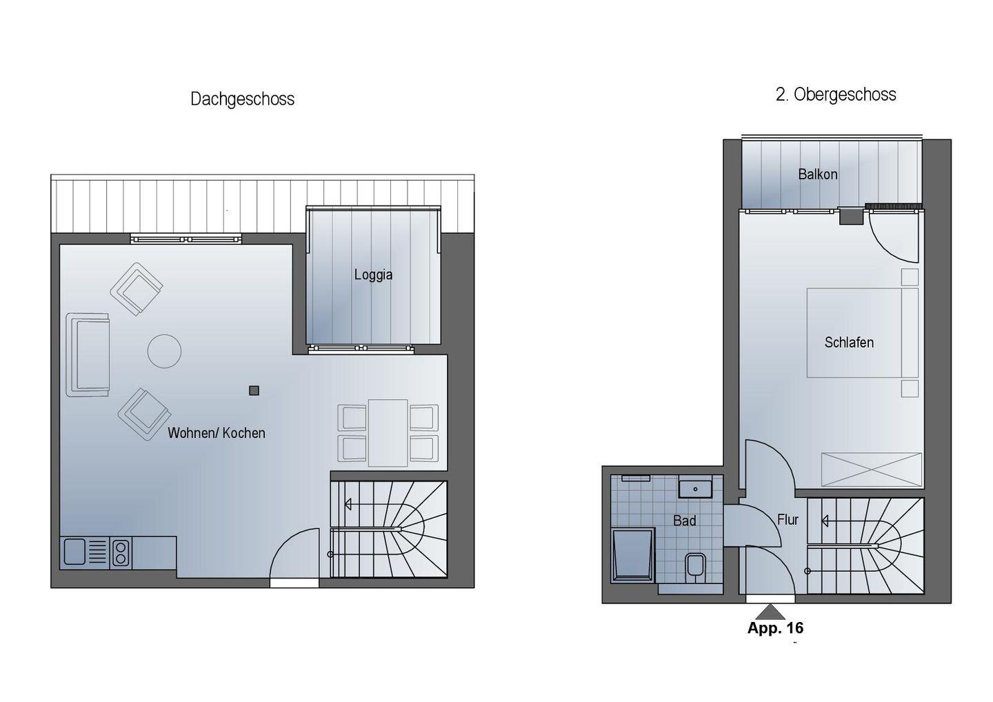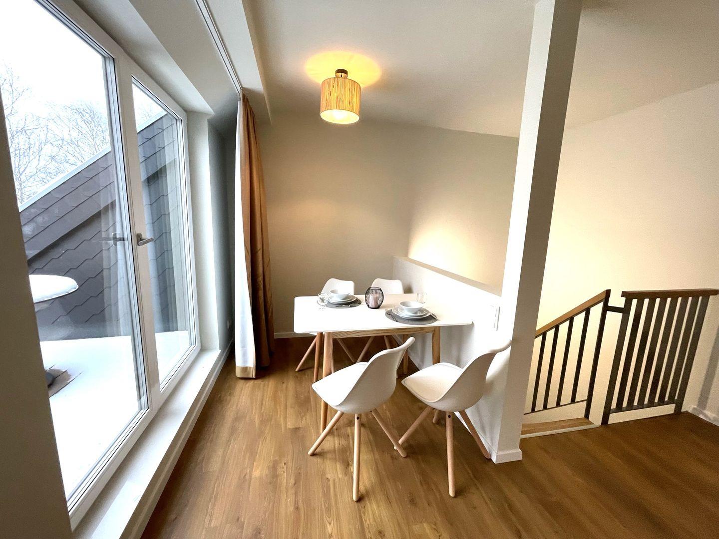 Auf dem Balkon stehen Ihnen moderne Terrassenmöbel zur Verfügung, sodass Sie beispielweise Ihr Frühstück oder Ihr Abendessen ganz privat im Sonnenschein zu sich nehmen können. Dieses Appartement ist eines der wenigen, welches sich über zwei Stockwerke erstreckt und eine zusätzliche Loggia bietet.
