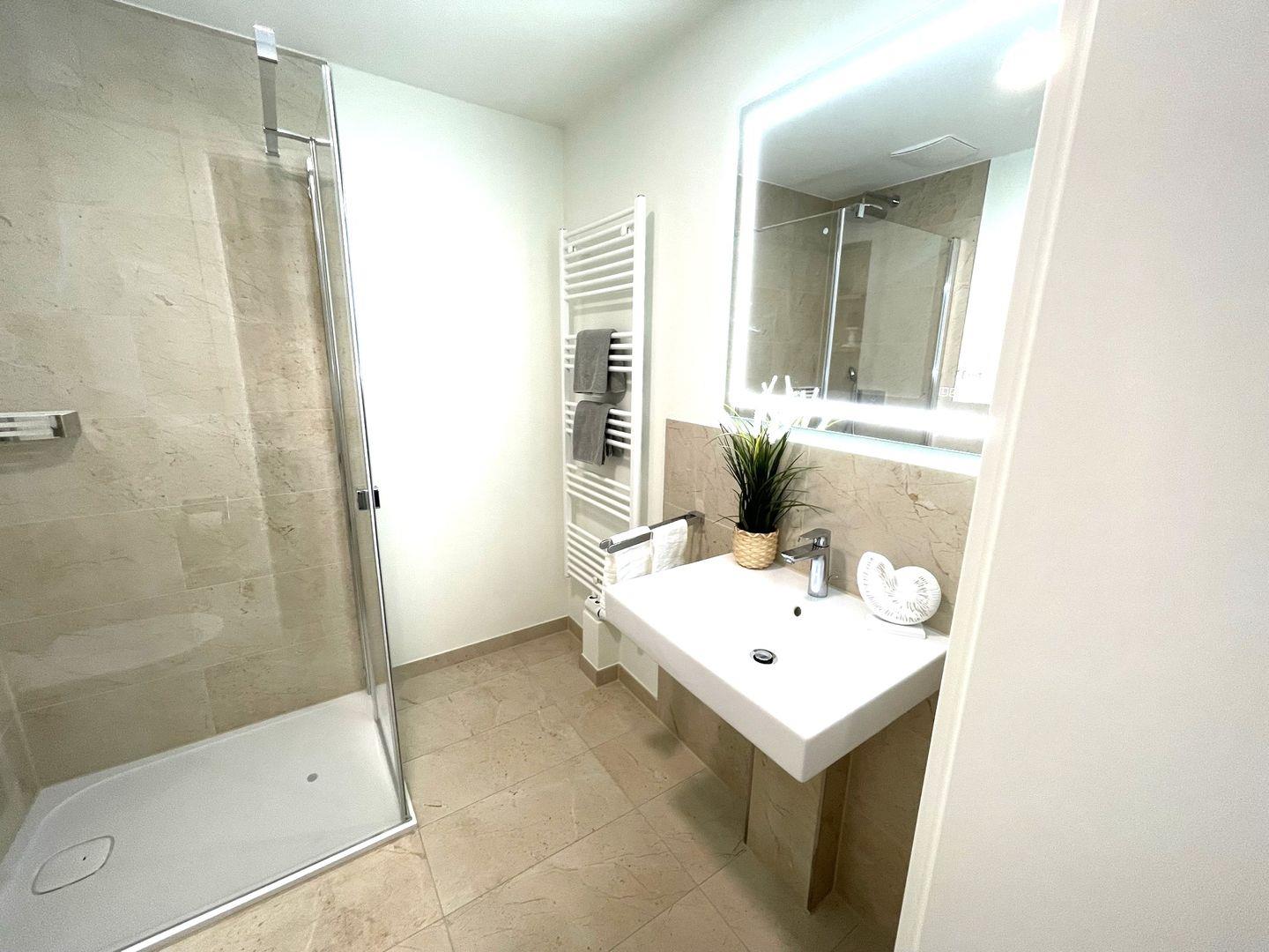 Das komfortable Appartement bietet auf 56 qm viel Platz für bis zu 4 Personen. Der Wohnbereich besitzt ein gemütliches Schlafsofa, welches sich mit wenigen Handgriffen zu einer Doppelschlafcouch (1,40m x 2,00m) umfunktionieren lässt, und sorgt mit einem Flat Screen-TV für reichlich Entertainment.
