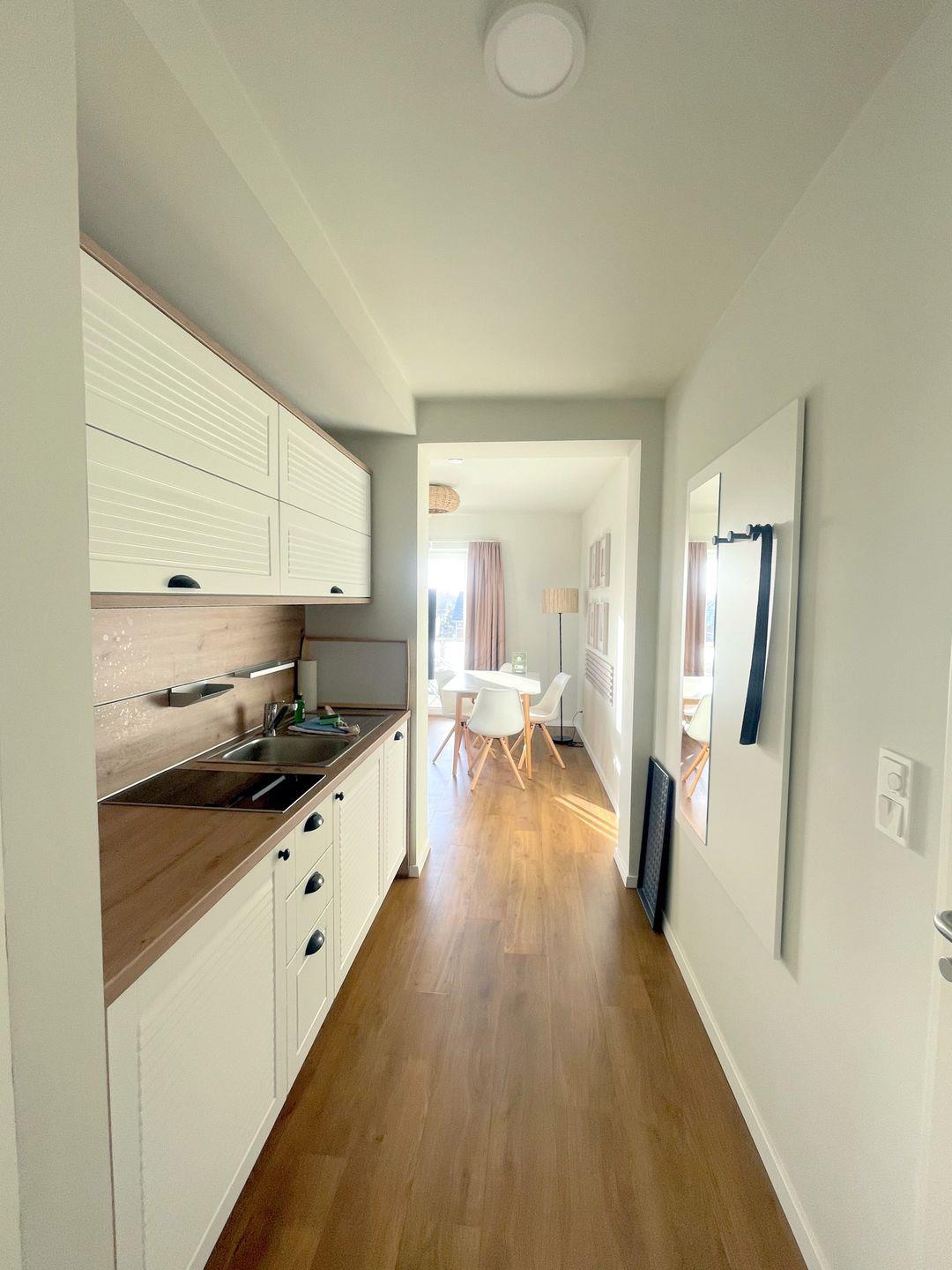 Die offene Pantryküche mit anliegendem Essbereich bieten Ihnen einen Geschirrspüler, Kühlschrank mit Gefrierfach, Kaffeemaschine, 2-Platten-Ceranfeld und Wasserkocher.