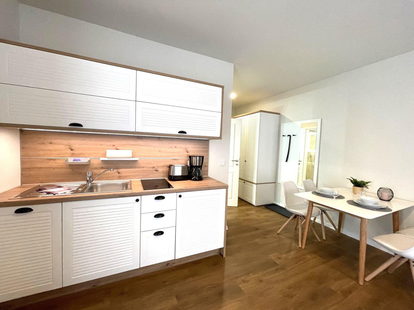 Die offene Pantryküche mit anliegendem Essbereich bieten Ihnen einen Geschirrspüler, Kühlschrank mit Gefrierfach, Kaffeemaschine, 2-Platten-Ceranfeld und Wasserkocher.