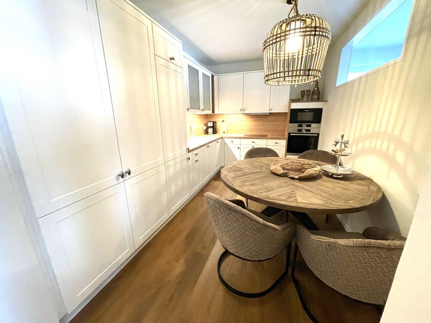 Die offene Pantryküche mit anliegendem Essbereich bieten Ihnen einen Geschirrspüler, Kühlschrank mit Gefrierfach, Kaffeemaschine, 2-Platten-Ceranfeld und Wasserkocher.