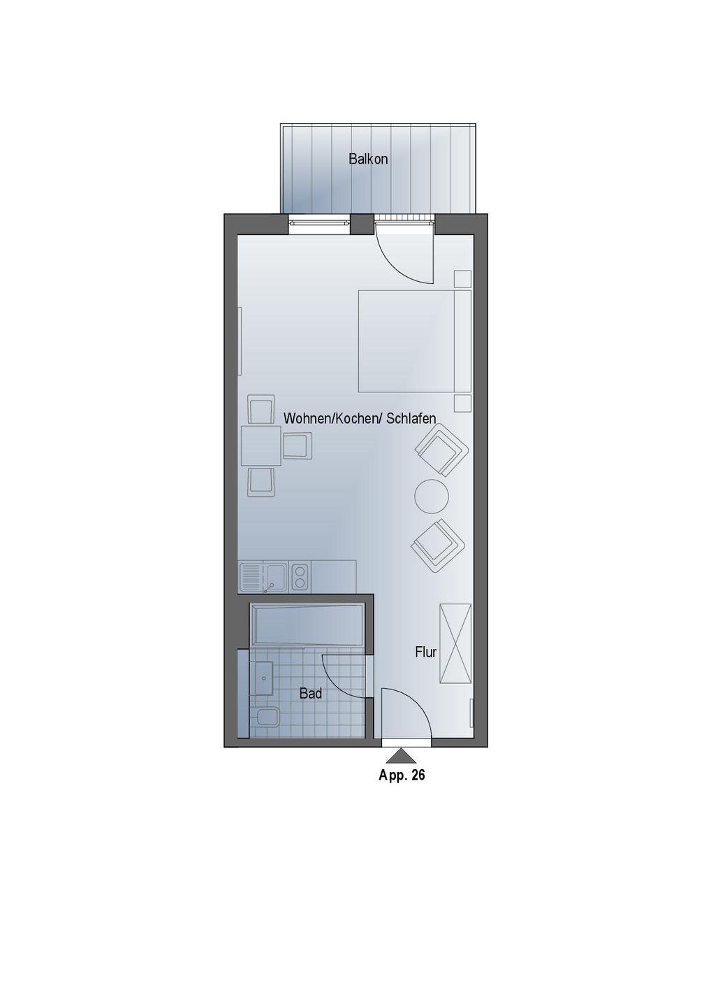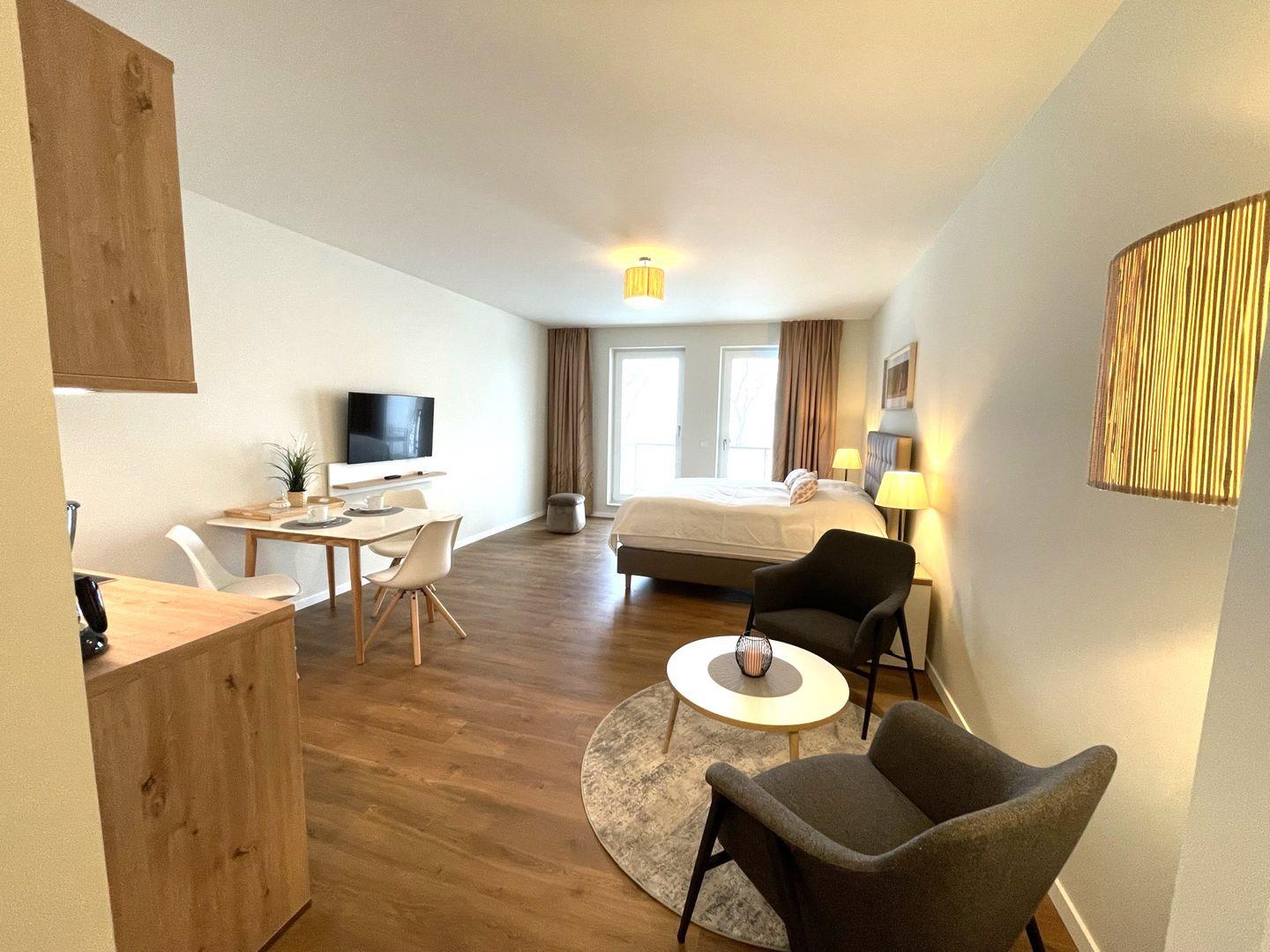 Das komfortable Appartement bietet auf 38 qm Platz für bis zu 2 Personen. Der gemütliche Wohn- und Schlafbereich besitzt ein modernes Doppelbett (1,80m x 2,00m), auf welchem Sie Ihre Erholung finden werden. Zu Ihrem Entertainment dient ein moderner Flatscreen-TV. Ein Kinderbett sowie ein Hochstuhl können auf Anfrage hinzugebucht werden.