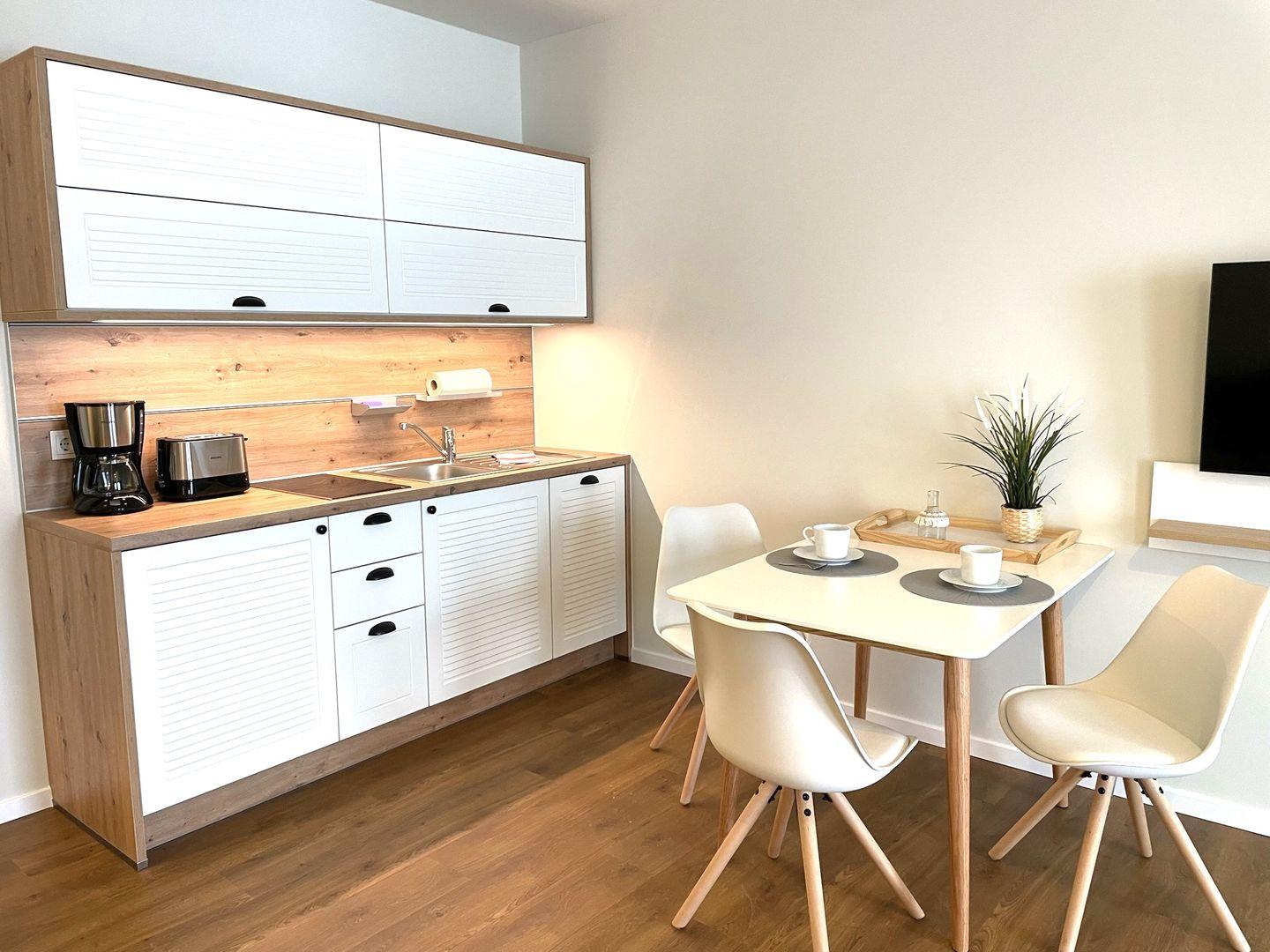 Die offene Pantryküche mit anliegendem Essbereich bieten Ihnen einen Geschirrspüler, Kühlschrank mit Gefrierfach, Kaffeemaschine, 2-Platten-Ceranfeld und Wasserkocher.