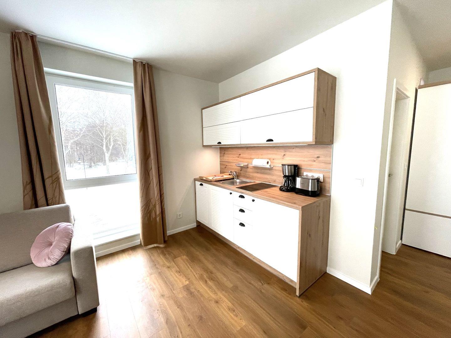 Die offene Pantryküche mit anliegendem Essbereich bieten Ihnen einen Geschirrspüler, Kühlschrank mit Gefrierfach, Kaffeemaschine, 2-Platten-Ceranfeld und Wasserkocher.