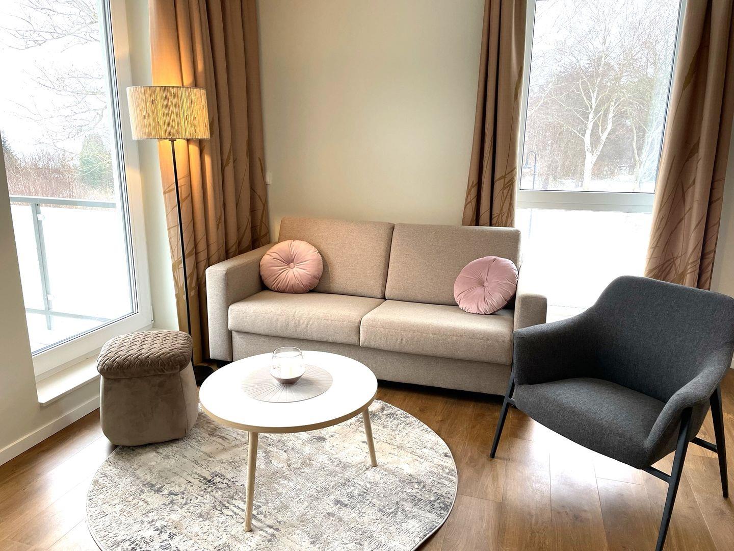 Das komfortable Appartement bietet auf 44 qm viel Platz für bis zu 4 Personen. Der gemütliche Wohnbereich besitzt ein bequemes Sofa, welches sich mit wenigen Handgriffen zu einer Doppelschlafcouch (1,40m x 2,00m) umfunktionieren lässt, und sorgt mit einem Flat Screen-TV und einer Musikanlage für reichlich Entertainment.