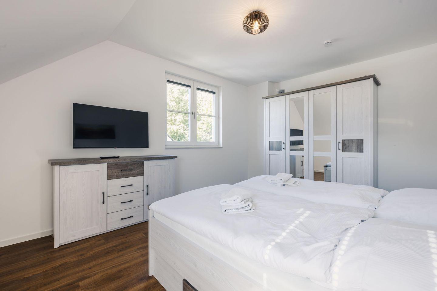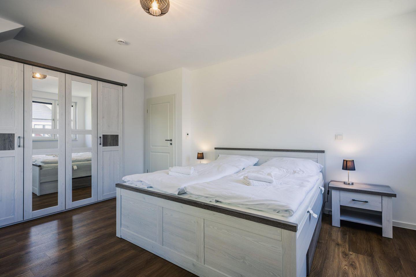 Die beiden Schlafzimmer bieten Ihnen jeweils ein modernes Doppelbett (1,80m x 2,00m), auf welchem Sie Erholung und Entspannung finden. Ein Kinderbett sowie ein Hochstuhl können auf Anfrage hinzugebucht werden.