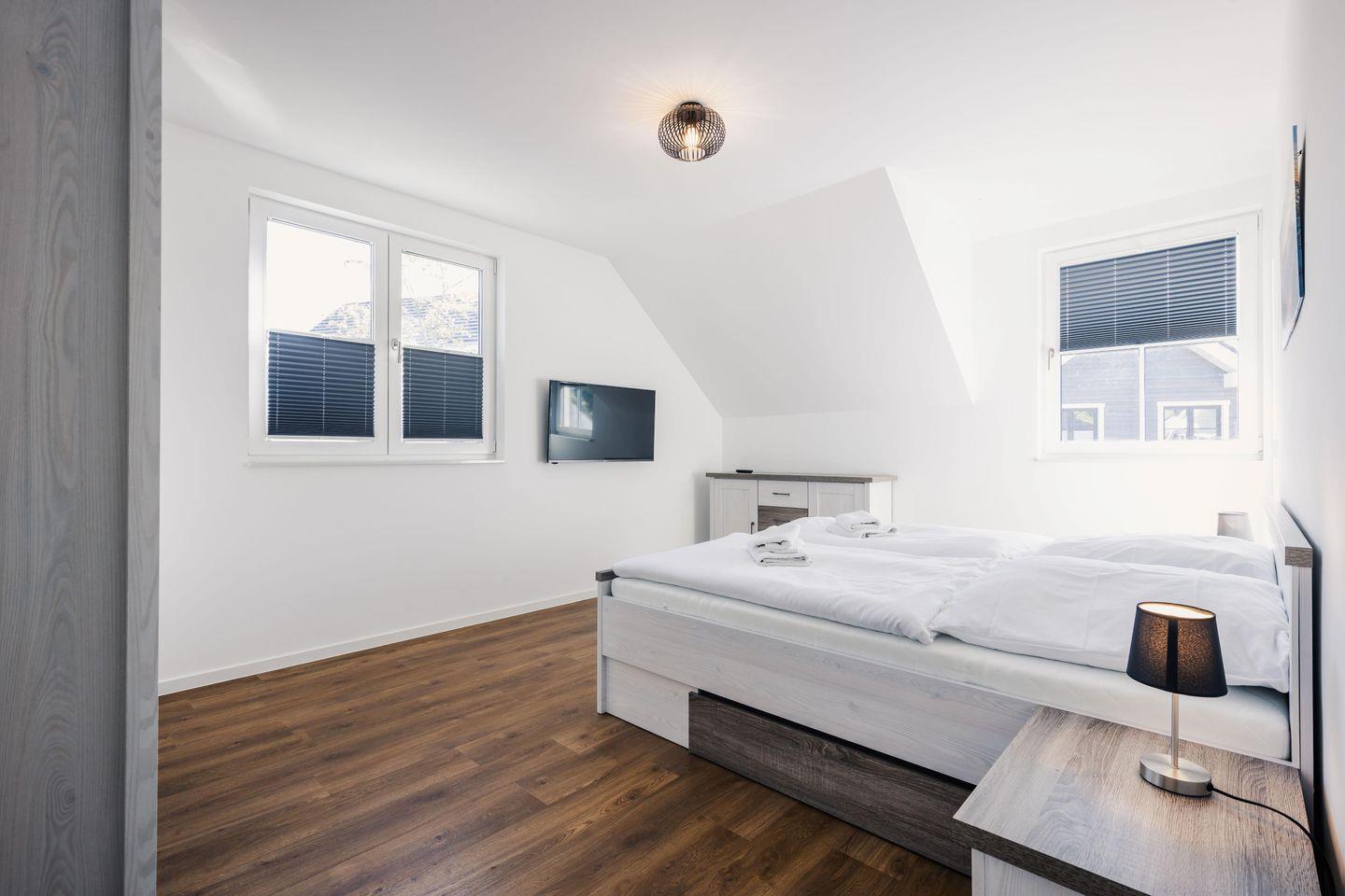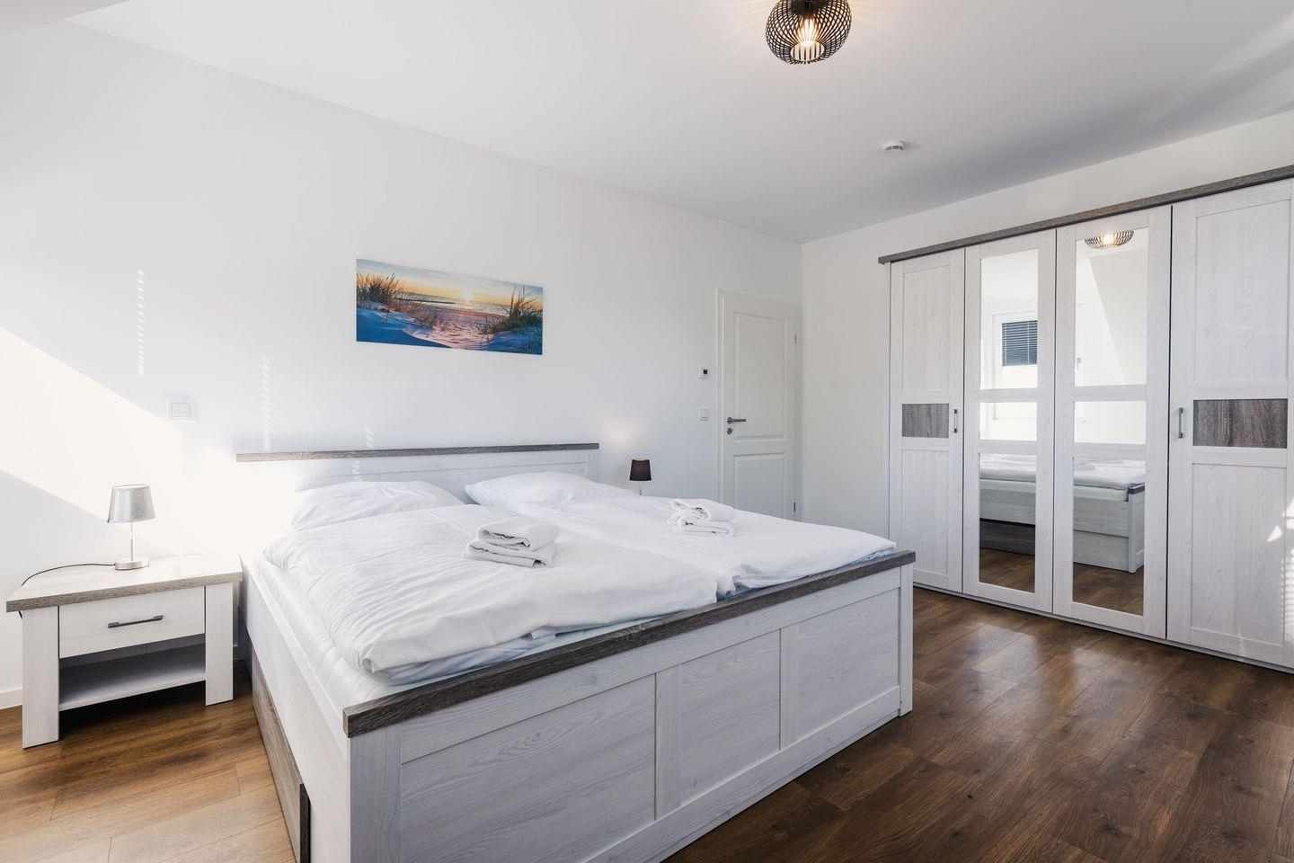 Die beiden Schlafzimmer bieten Ihnen jeweils ein modernes Doppelbett (1,80m x 2,00m), auf welchem Sie Erholung und Entspannung finden. Ein Kinderbett sowie ein Hochstuhl können auf Anfrage hinzugebucht werden.
