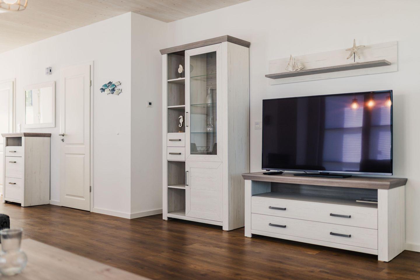 Das gemütliche Ferienhaus bietet auf ca. 100 qm viel Platz für bis zu 6 Personen. Der komfortable Wohnbereich besitzt ein bequemes Sofa mit Kuscheldecke und sorgt mit einem Flat Screen-TV für Entertainment.
