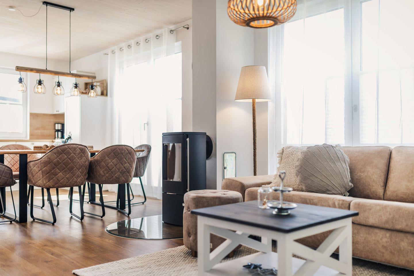 Das gemütliche Ferienhaus bietet auf ca. 100 qm viel Platz für bis zu 6 Personen. Der komfortable Wohnbereich mit Kamin besitzt ein bequemes Schlafsofa mit Kuscheldecke und sorgt mit einem Flat Screen-TV für Entertainment.