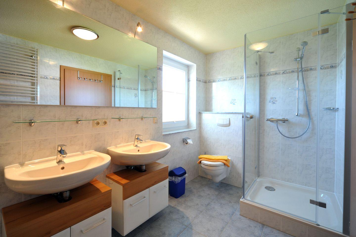 Im Obergeschoss erwarten Sie zwei geschmackvoll eingerichtete Schlafzimmer: eines mit einem komfortablen Doppelbett und großzügigem Kleiderschrank, das andere mit zwei Einzelbetten – ideal für Kinder. Das modern gestaltete Badezimmer ist mit Dusche, Badewanne, WC und zwei Waschbecken ausgestattet – perfekt für einen entspannten Start in den Tag.