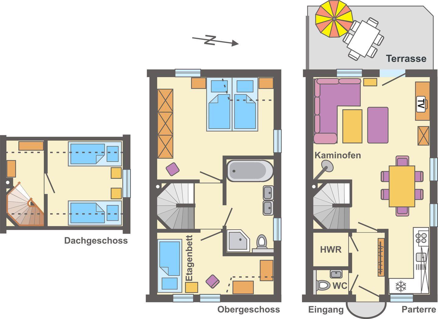 Die Haushälfte 8A erstreckt sich über drei Etagen und bietet auf großzügigen ca. 100 m² ausreichend Raum für bis zu 6 Personen. Das Erdgeschoss empfängt Sie mit einem lichtdurchfluteten Wohn- und Essbereich, einer bequemen Polstersitzecke, Flachbild-TV und einem gemütlichen Kaminofen – ideal für entspannte Abende. Die voll ausgestattete Küchenzeile mit E-Herd, Geschirrspüler und allen wichtigen Utensilien lässt keine Wünsche offen. Ein separates Gäste-WC sowie ein Hauswirtschaftsraum mit Waschmaschine ergänzen die Ausstattung im Erdgeschoss.