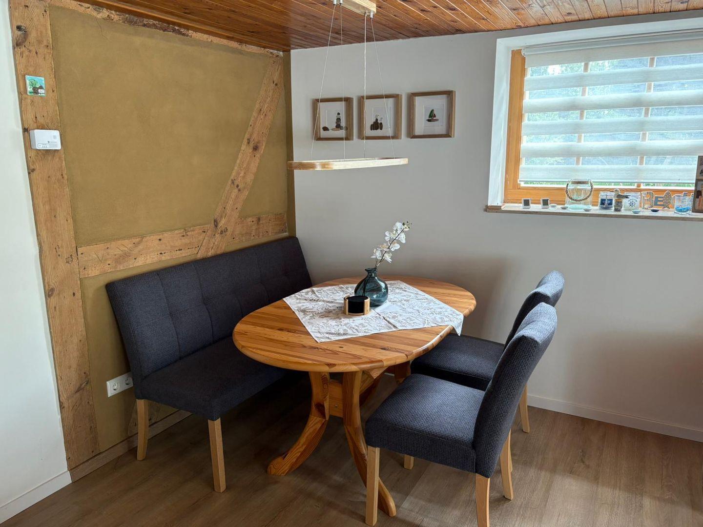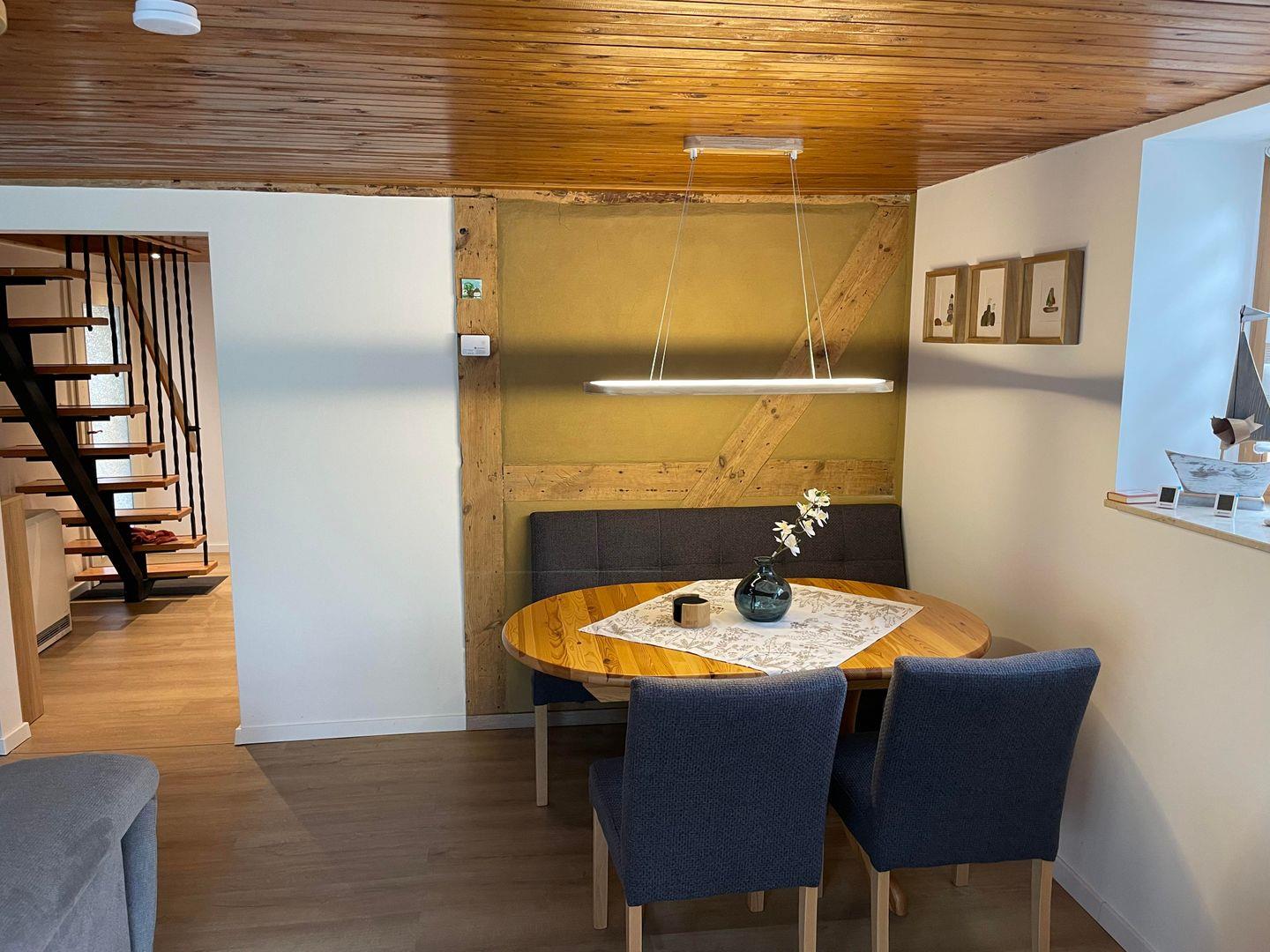 Das Fischerhuus überzeugt durch seine geschmackvolle Ausstattung und die liebevoll gestalteten Räume. Der gemütliche Wohnbereich ist mit einer Sofaecke mit Kaminofen und einem Fernseher ausgestattet, der Ihnen eine Auswahl internationaler Kanäle bietet. Hier können Sie nach aufregenden Tagen entspannen und die Abende gemeinsam ausklingen lassen. Der Essbereich und die vollständig ausgestattete, geschlossene Küche mit modernen Annehmlichkeiten wie Cerankochfeld, Mikrowelle, Spülmaschine und Kaffeemaschine ermöglichen Ihnen eine komfortable Selbstverpflegung. Bei einem Frühstück auf der Terrasse können Sie den Blick in den Garten genießen und den Tag entspannt beginnen.