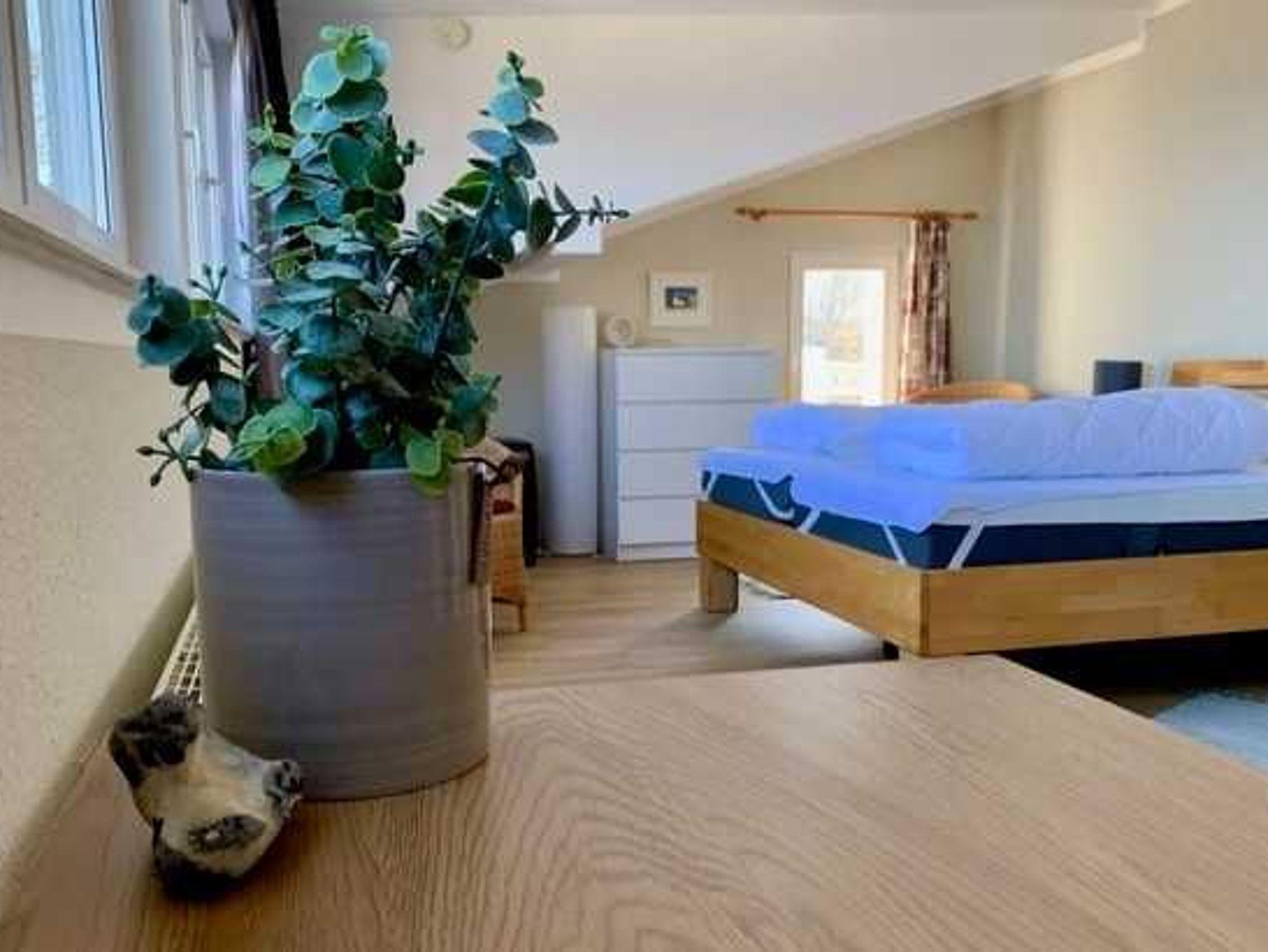 Im Obergeschoss: ein großer Schlafraum mit Doppelbett und DU/WC. Zusätzlich befindet sich hier noch ein Schreibtisch und eine gemütliche Lese-Ecke mit Sessel und tollem Blick.