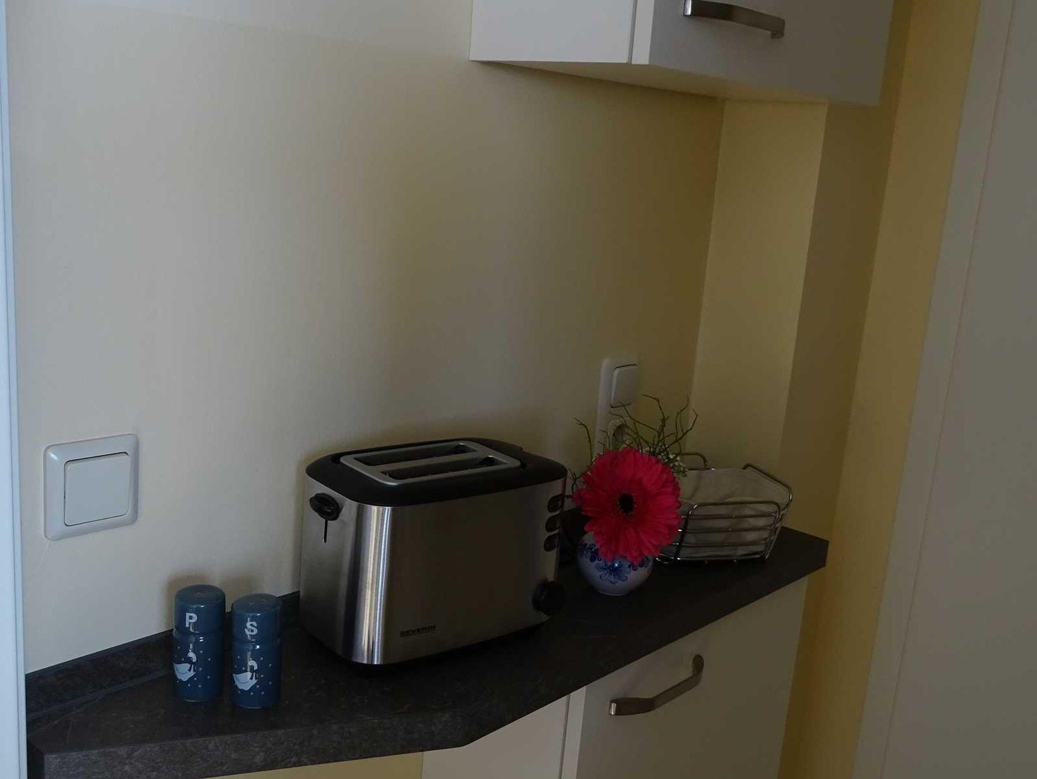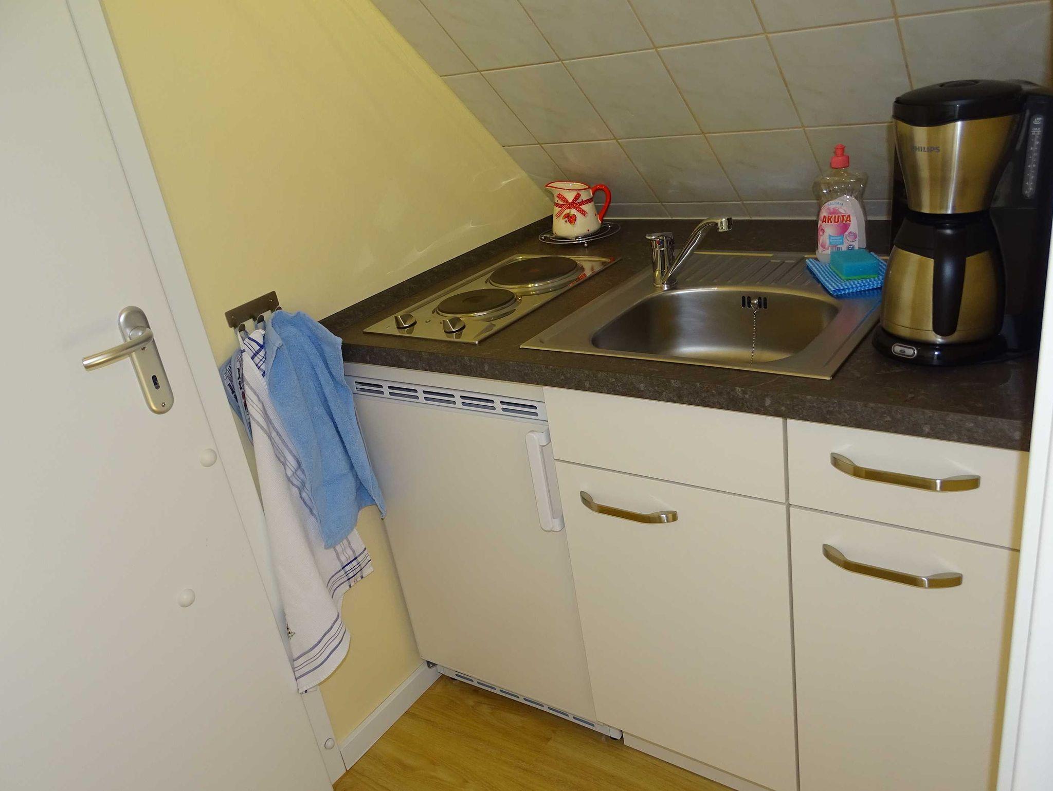 Die Ferienwohnung im Obergeschoß verfügt über ein Wohnzimmer, ein separates Schlafzimmer mit Doppelbett, Dusche/WC, Miniküche (Toaster, Eierkocher, Wasserkocher, Kaffeemaschine, Besteck, Geschirr), und Sat-TV, Radio.