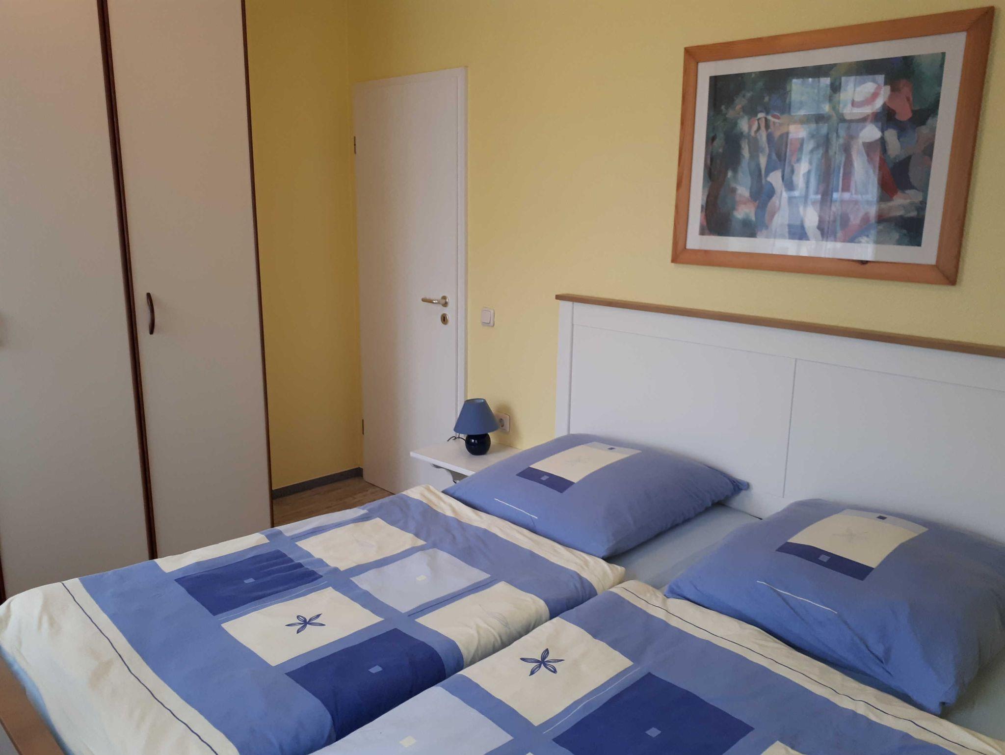 Über den Flur geht es ins Duschbad und zum Schlafzimmer mit Doppelbett (1,80 m x 1,90 m), großem Spiegel und geräumigen Kleiderschrank.