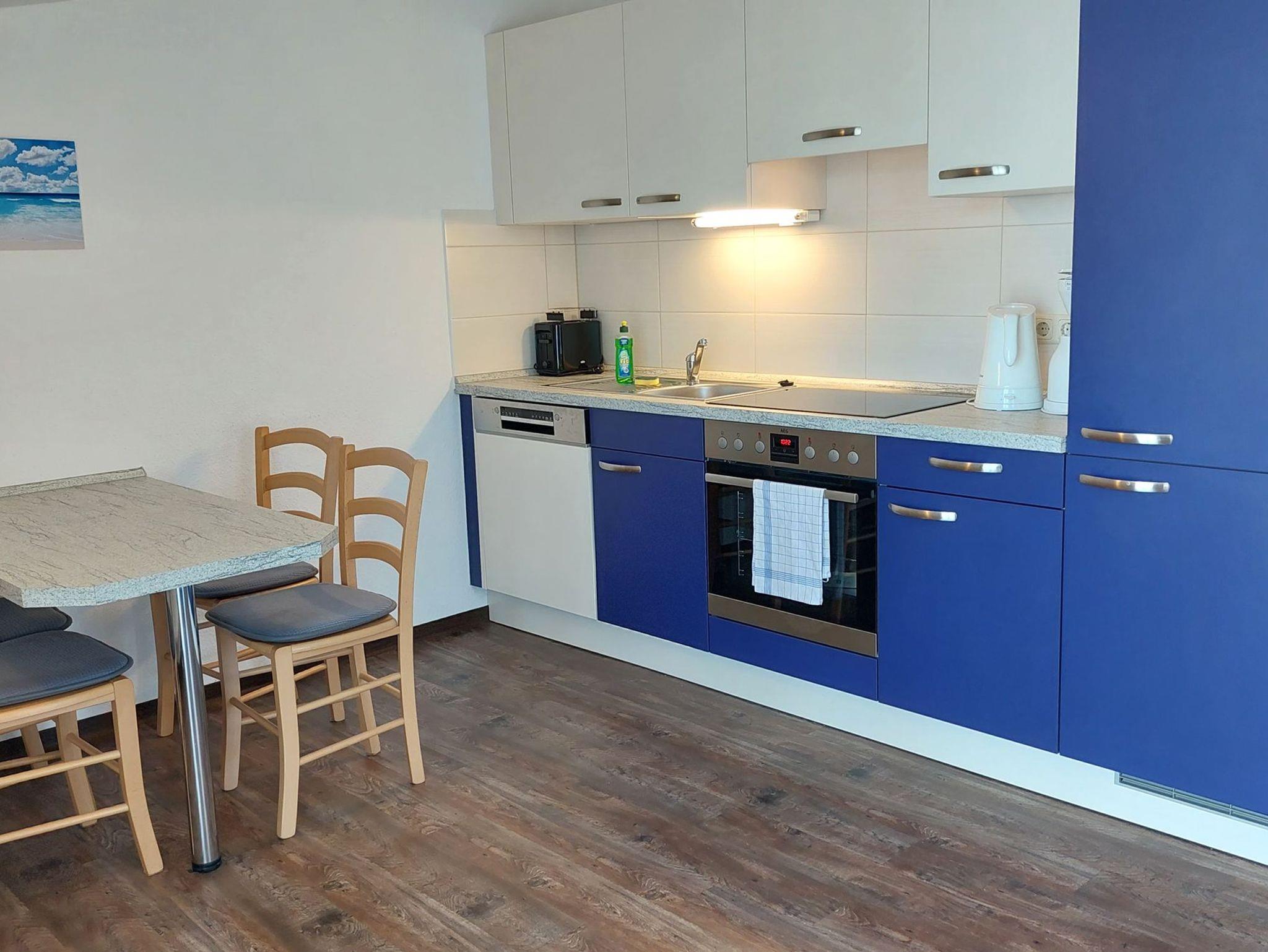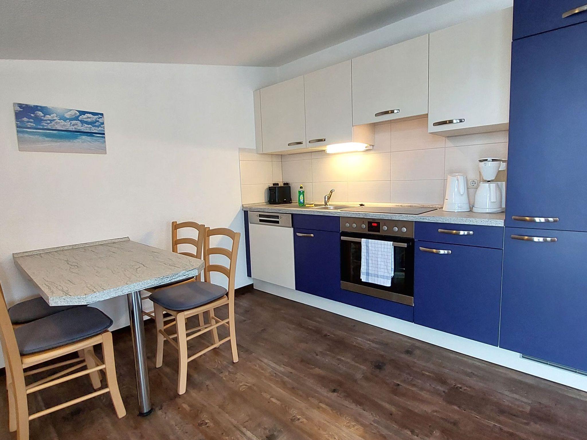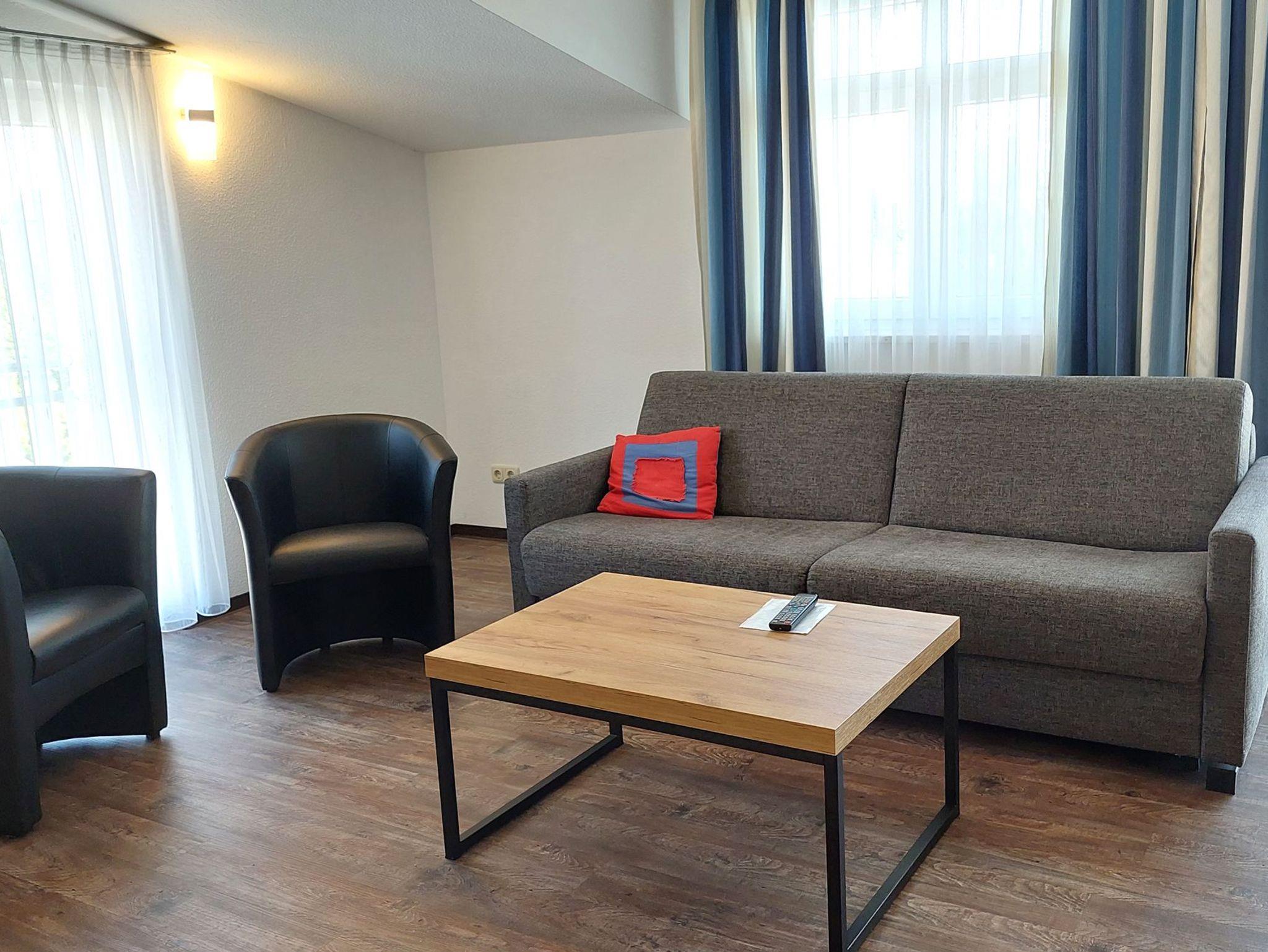 Diese freundliche Wohnung ist aufgeteilt in einen Wohnraum mit Balkon und integrierter Küchenzeile, ein Schlafzimmer und ein Duschbad mit Waschtisch und WC. Das Wohnzimmer begrüßt Sie mit einem Schlafsofa und Sessel sowie Flachbild-TV. Das Schlafzimmer verfügt über ein Doppelbett (1,80m x 2m) sowie einen Kleiderschrank. Die Küchenzeile ist mit Backofen, Geschirrspüler, Cerankochfeld, Kühlschrank mit kleinem Gefrierfach, Cerankochfeld, Mikrowelle, Kaffeemaschine, Wasserkocher und Toaster ausgestattet. Highlights: Kostenfreies WLAN sowie ein frei wählbarer PKW-Stellplatz direkt am Haus.