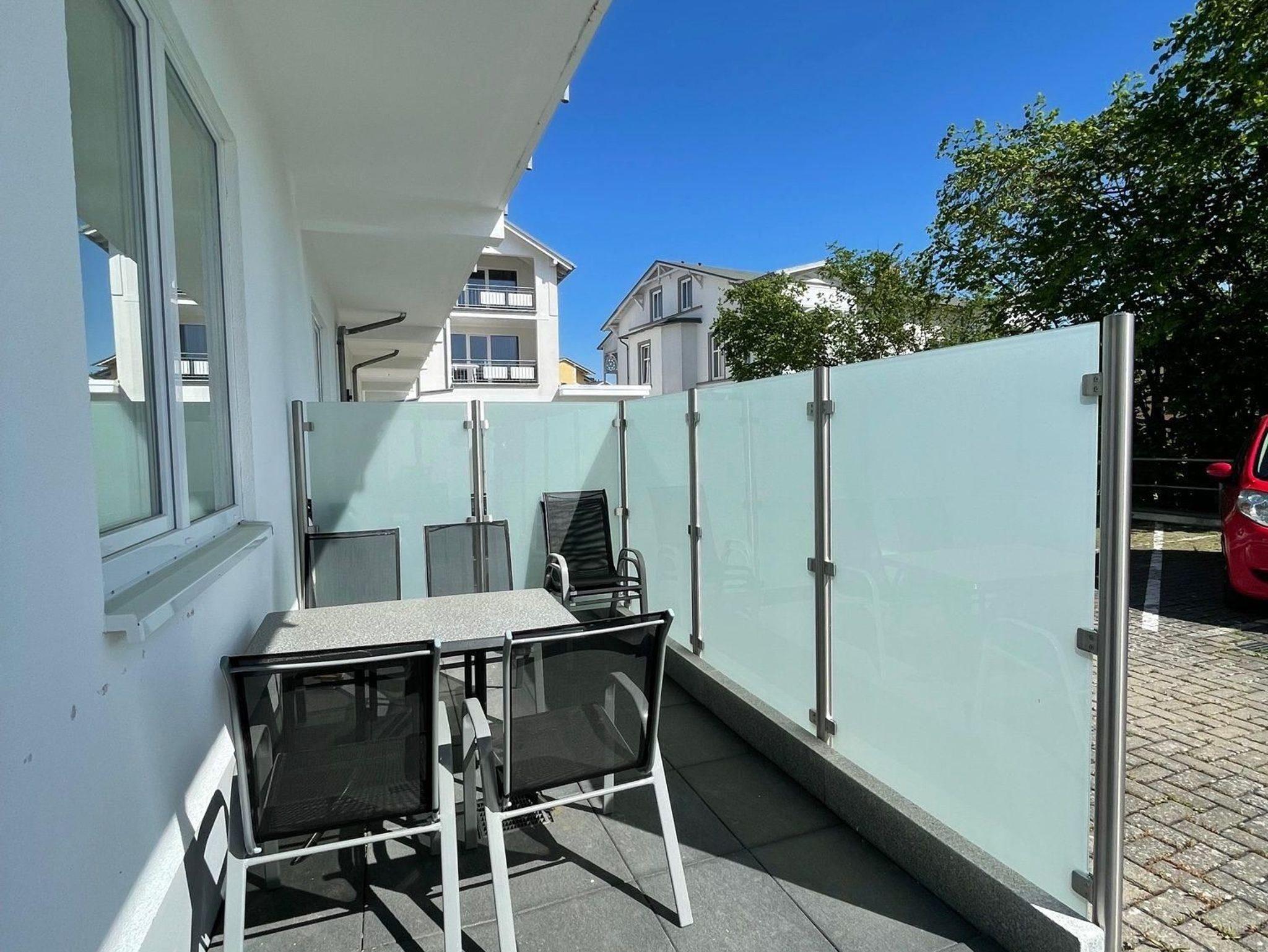 * Terrasse mit Glassichtschutz und Gartenmöbeln (am Parkplatz)