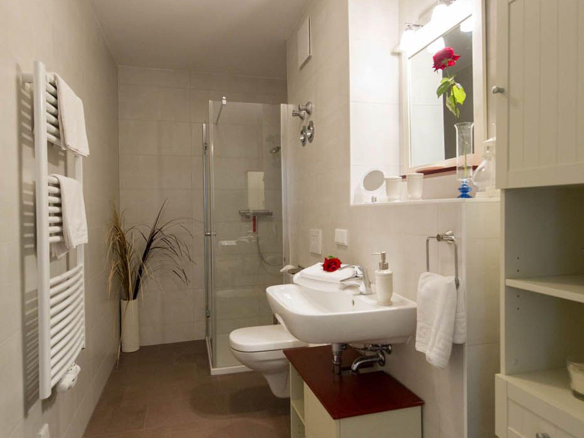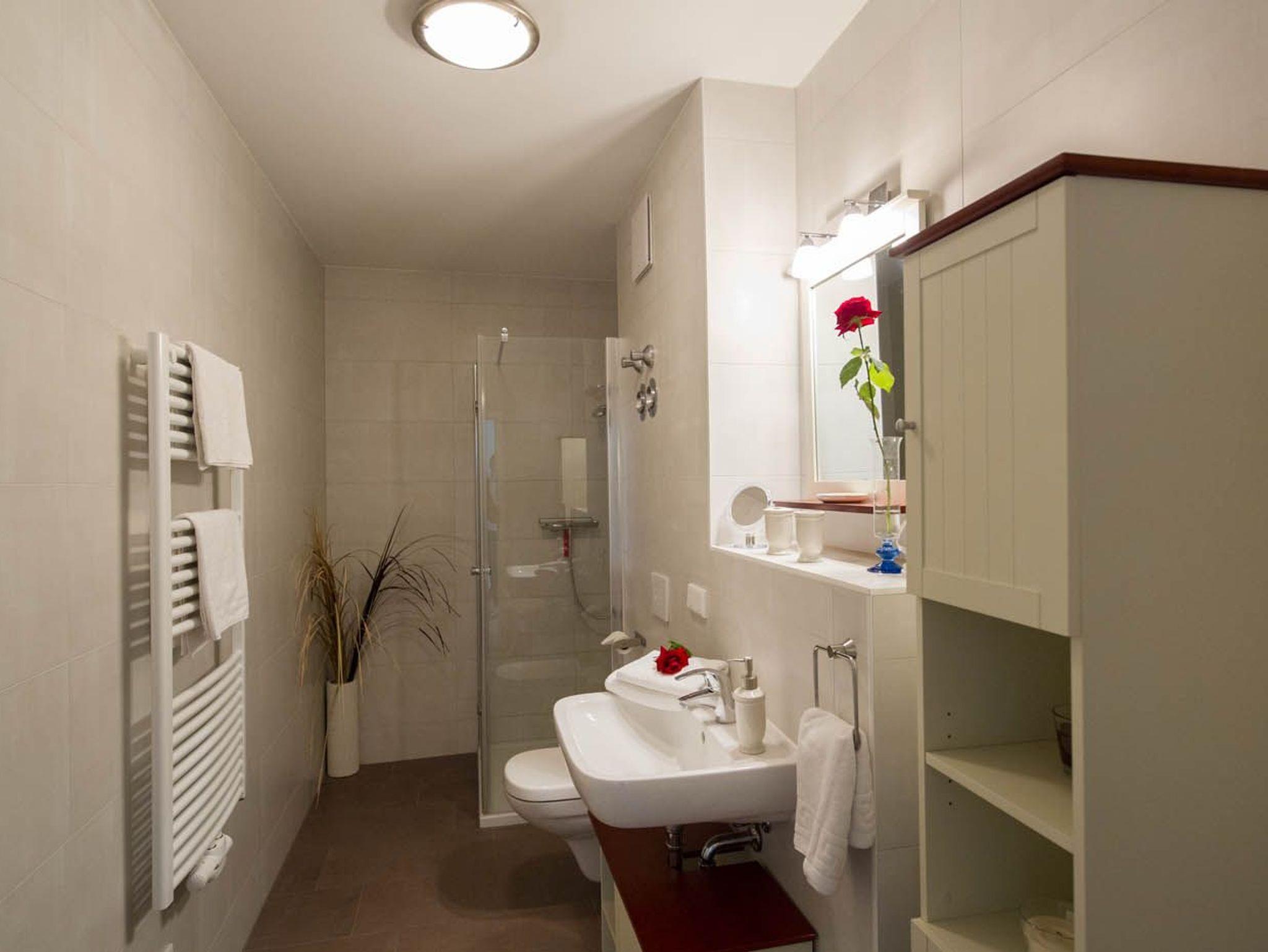 * Bad mit großer ebenerdiger Dusche, WC und Föhn