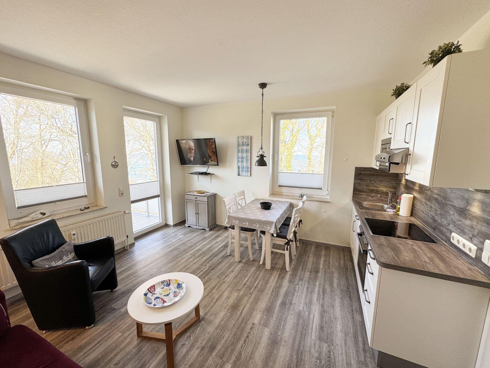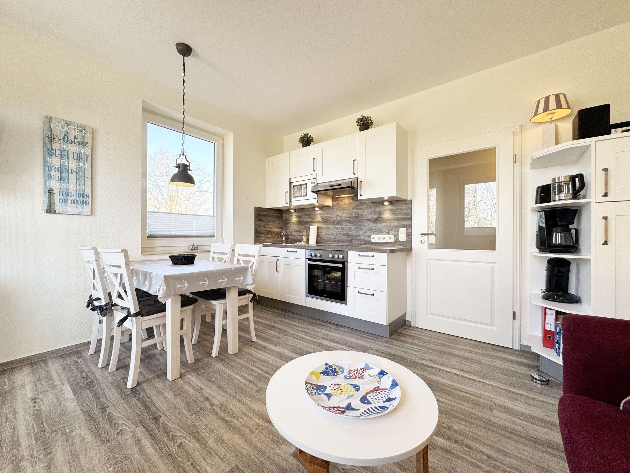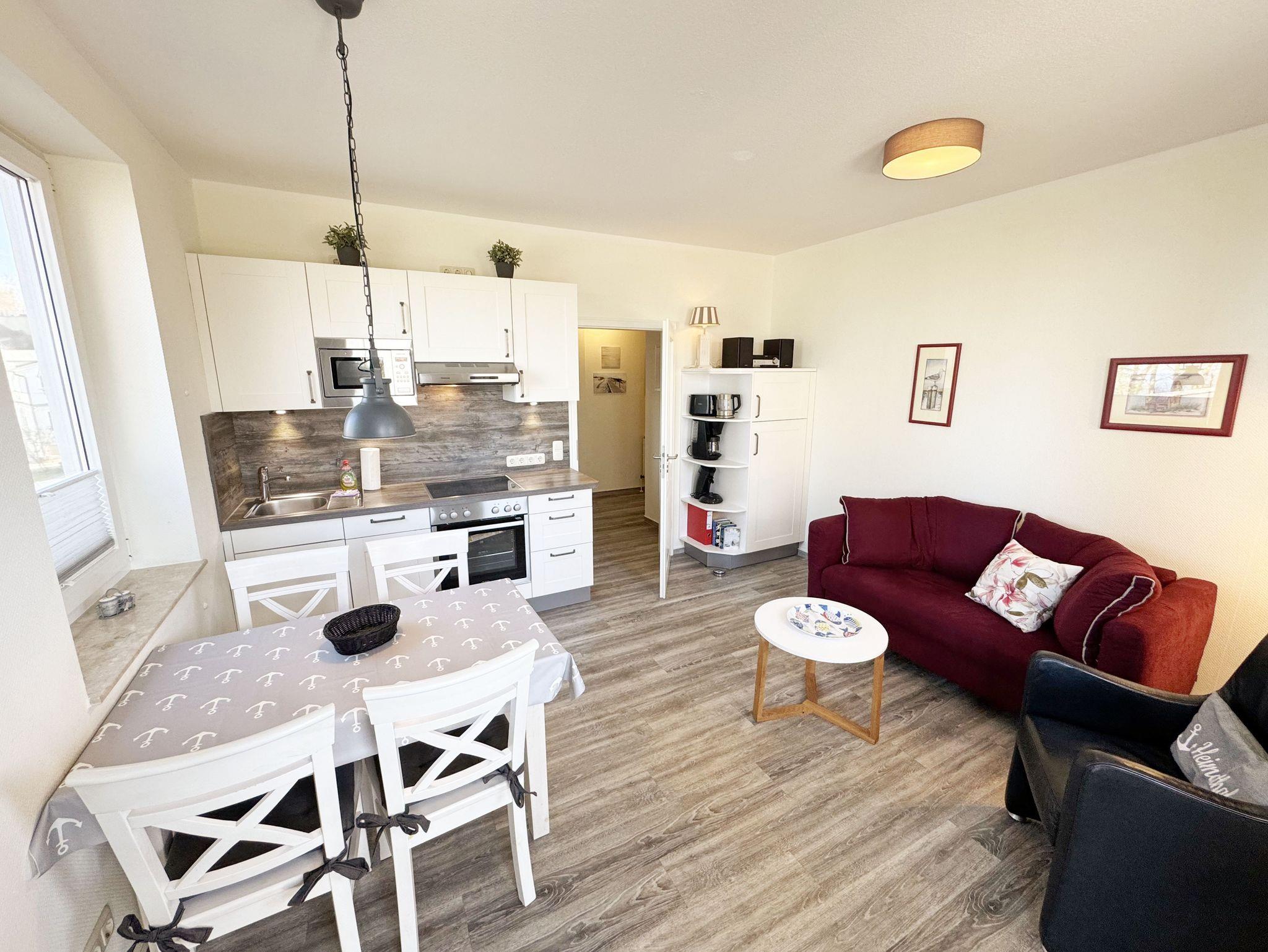 Die helle und freundliche 2-Raumferienwohnung im 2. Obergeschoss umfasst ca. 45 m² und ist eine Nichtraucherwohnung. Die Wohnung ist für max. 2 Erwachsene ausgestattet und ist bequem über das Treppenhaus oder den Aufzug zu erreichen. Sie verfügt über einen geräumigen Flurbereich sowie ein Wohn-/Esszimmer mit einer Couch, Sessel, Couchtisch, Esstisch und eine neue, sehr gut ausgestattete Einbauküche mit Backofen, Ceran-Kochfeld, Mikrowelle, Spülmaschine, Kühlschrank mit Gefrierfach, Kaffeemaschine, Senseo Pad-Maschine, Wasserkocher, Toaster, Eierkocher, Mixer sowie diverse Küchenutensilien. Der technische und der Unterhaltungsbereich wird durch einen Smart-TV, Blu-Ray-Player, Stereoanlage mit CD-Player und USB-Anschluss, eine Spielesammlung, eine kleine Auswahl an Büchern sowie einen kostenloser Internetanschluss (WLAN) abgerundet. Der großzügige und überdachte Balkon (Nord/West) mit Bestuhlung und Sonnenschirm lädt zum Entspannen ein und ist über das Wohn-/Esszimmer zu erreichen. Von hier haben Sie einen Blick ins Grüne, Richtung Ostsee, wo Sie das Wellenrauschen (natürlich bei ausreichend Wind) genießen können. Das Schlafzimmer ist mit einem Doppelbett (Härtegrad 2 und 3, Liegefläche 1,80 m x 2,00 m), verstellbare Lattenroste, Nachttischablagen, einem Herrendiener, einem Kleiderschrank, Smart-TV und Verdunklungsgardinen sowie Plissee ausgestattet. Das moderne und geflieste Bad mit WC, Waschtisch, Dusche, Badmöbeln, Kosmetikspiegel und Fön bietet ausreichend Komfort für Ihren Urlaubsaufenthalt. Im Wohn- & Schlafzimmer finden Sie zusätzlich ein Insektenschutzgitter. Der PKW-Stellplatz befindet sich direkt am Haus. Ein abschließbarer Gemeinschaftsabstellraum und Fahrradständer hinter dem hauseigenen Parkplatz sind ebenso nutzbar. Die Mitnahme eines Haustieres ist gegen eine Gebühr möglich. Die Erstausstattung eines Wäschepaketes (komplette Bettwäsche, 1 Duschhandtuch, 2 kleine Handtücher, 2 Geschirrhandtücher) können Sie bis 14 Tage vor Anreise gegen einen Aufpreis dazu buchen oder durch eigene ergänzen.
