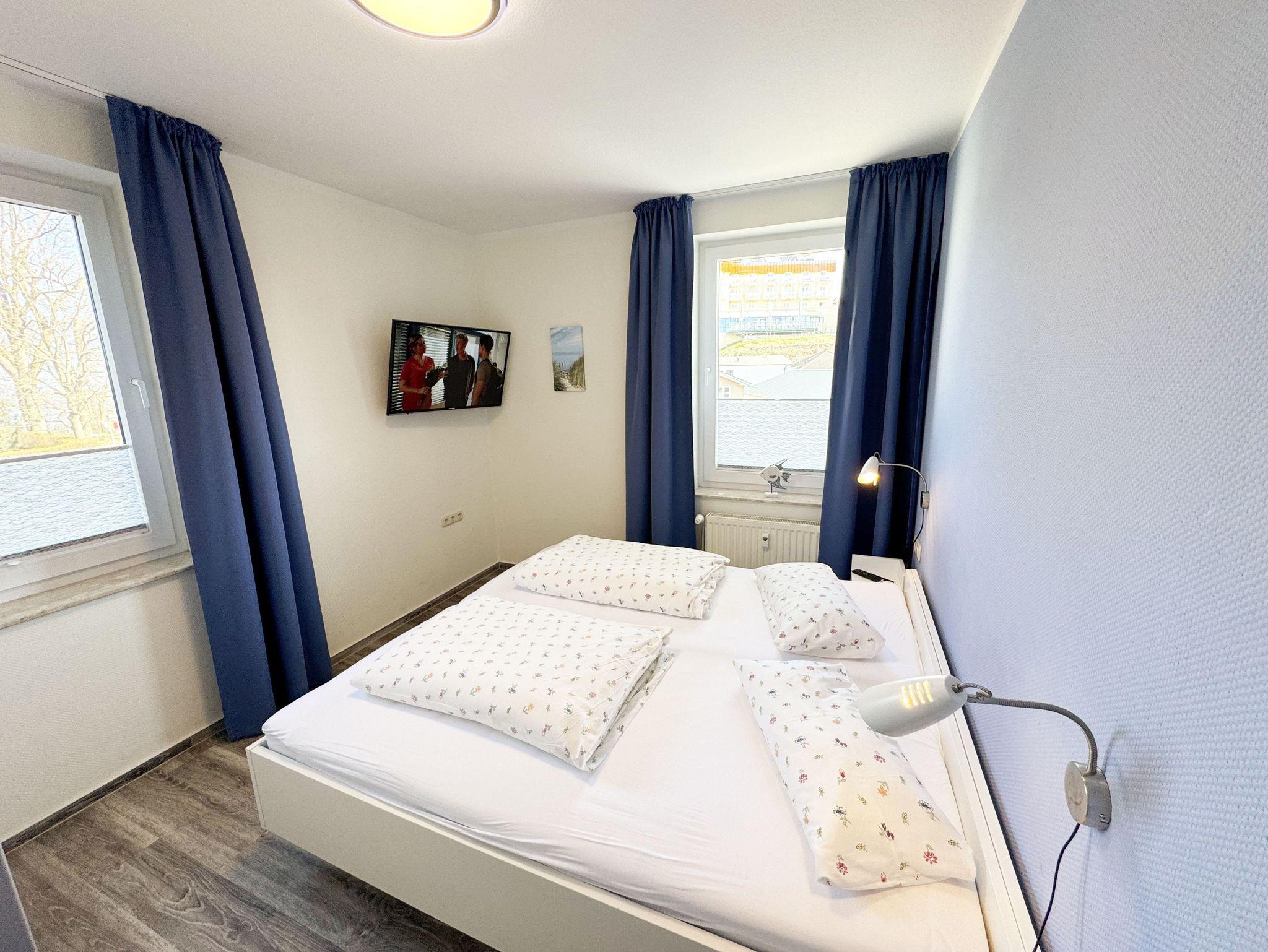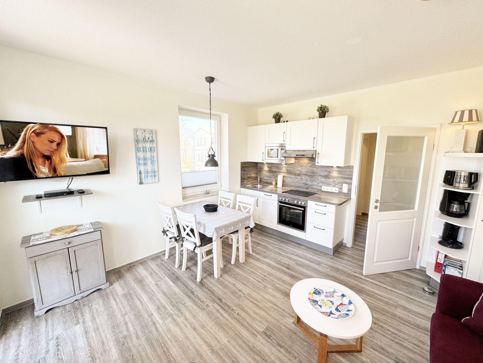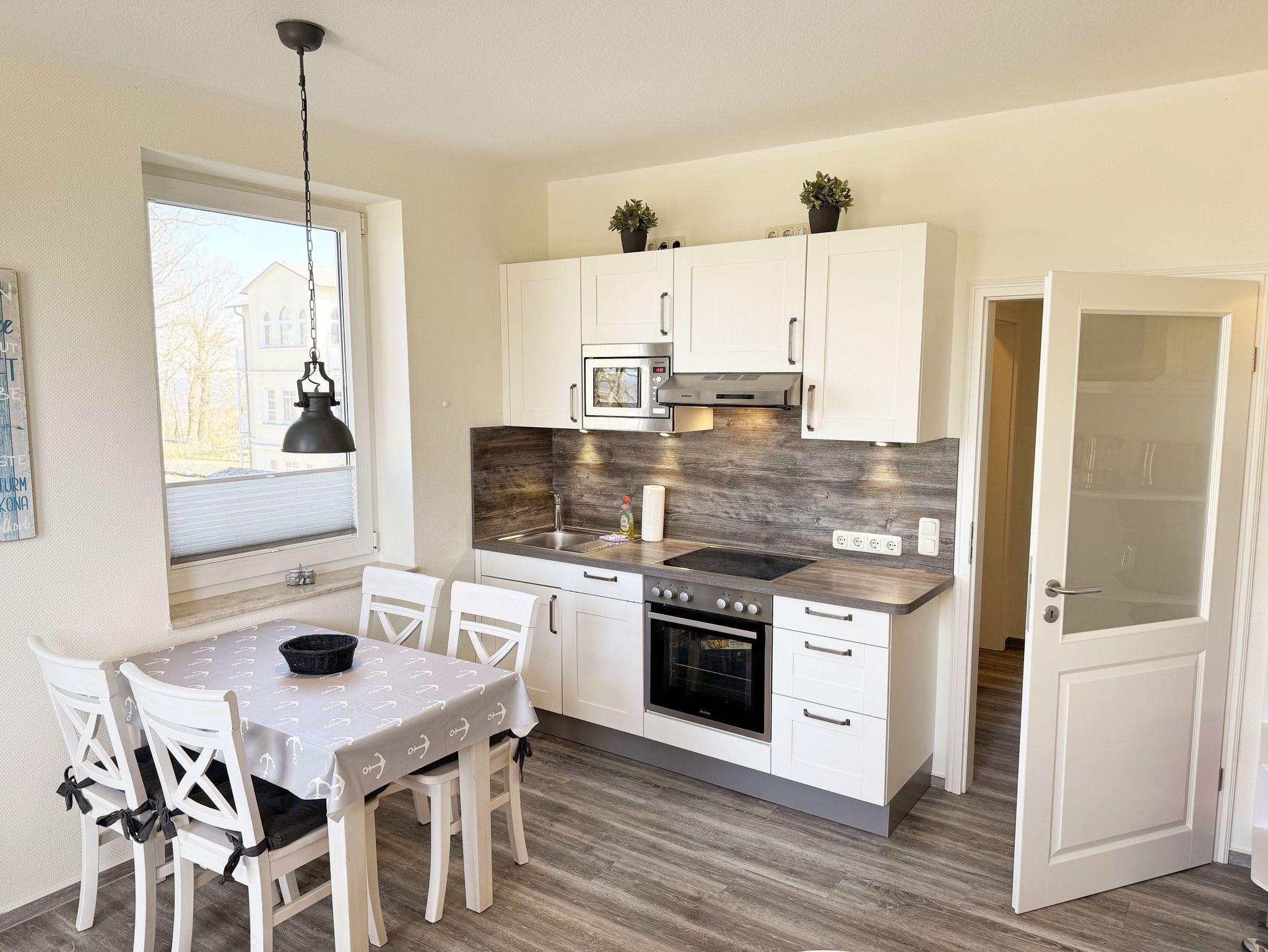 Die helle und freundliche 2-Raumferienwohnung im 2. Obergeschoss umfasst ca. 45 m² und ist eine Nichtraucherwohnung. Die Wohnung ist für max. 2 Erwachsene ausgestattet und ist bequem über das Treppenhaus oder den Aufzug zu erreichen. Sie verfügt über einen geräumigen Flurbereich sowie ein Wohn-/Esszimmer mit einer Couch, Sessel, Couchtisch, Esstisch und eine neue, sehr gut ausgestattete Einbauküche mit Backofen, Ceran-Kochfeld, Mikrowelle, Spülmaschine, Kühlschrank mit Gefrierfach, Kaffeemaschine, Senseo Pad-Maschine, Wasserkocher, Toaster, Eierkocher, Mixer sowie diverse Küchenutensilien. Der technische und der Unterhaltungsbereich wird durch einen Smart-TV, Blu-Ray-Player, Stereoanlage mit CD-Player und USB-Anschluss, eine Spielesammlung, eine kleine Auswahl an Büchern sowie einen kostenloser Internetanschluss (WLAN) abgerundet. Der großzügige und überdachte Balkon (Nord/West) mit Bestuhlung und Sonnenschirm lädt zum Entspannen ein und ist über das Wohn-/Esszimmer zu erreichen. Von hier haben Sie einen Blick ins Grüne, Richtung Ostsee, wo Sie das Wellenrauschen (natürlich bei ausreichend Wind) genießen können. Das Schlafzimmer ist mit einem Doppelbett (Härtegrad 2 und 3, Liegefläche 1,80 m x 2,00 m), verstellbare Lattenroste, Nachttischablagen, einem Herrendiener, einem Kleiderschrank, Smart-TV und Verdunklungsgardinen sowie Plissee ausgestattet. Das moderne und geflieste Bad mit WC, Waschtisch, Dusche, Badmöbeln, Kosmetikspiegel und Fön bietet ausreichend Komfort für Ihren Urlaubsaufenthalt. Im Wohn- & Schlafzimmer finden Sie zusätzlich ein Insektenschutzgitter. Der PKW-Stellplatz befindet sich direkt am Haus. Ein abschließbarer Gemeinschaftsabstellraum und Fahrradständer hinter dem hauseigenen Parkplatz sind ebenso nutzbar. Die Mitnahme eines Haustieres ist gegen eine Gebühr möglich. Die Erstausstattung eines Wäschepaketes (komplette Bettwäsche, 1 Duschhandtuch, 2 kleine Handtücher, 2 Geschirrhandtücher) können Sie bis 14 Tage vor Anreise gegen einen Aufpreis dazu buchen oder durch eigene ergänzen.