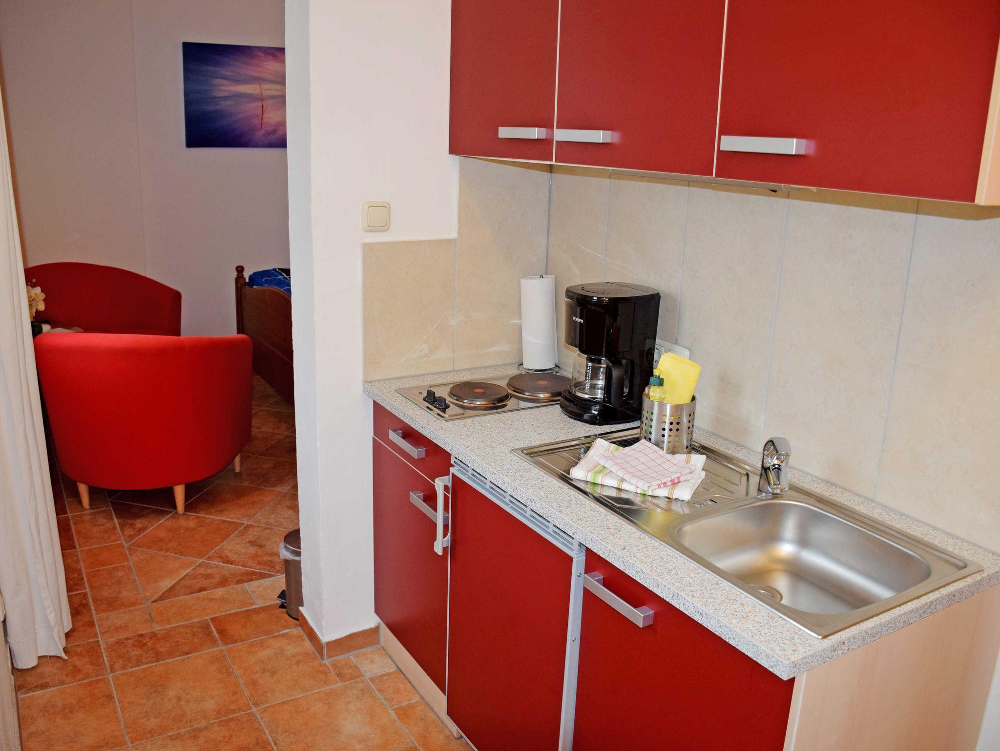 Eingangsbereich mit gut ausgestatteter Pentriküche mit: 2-Zonen-Kochfeld, kleinem Kühlschrank mit Frostfach und Spüle, Toaster, Kaffeemaschine, Wasserkocher und Küchenutensilien.