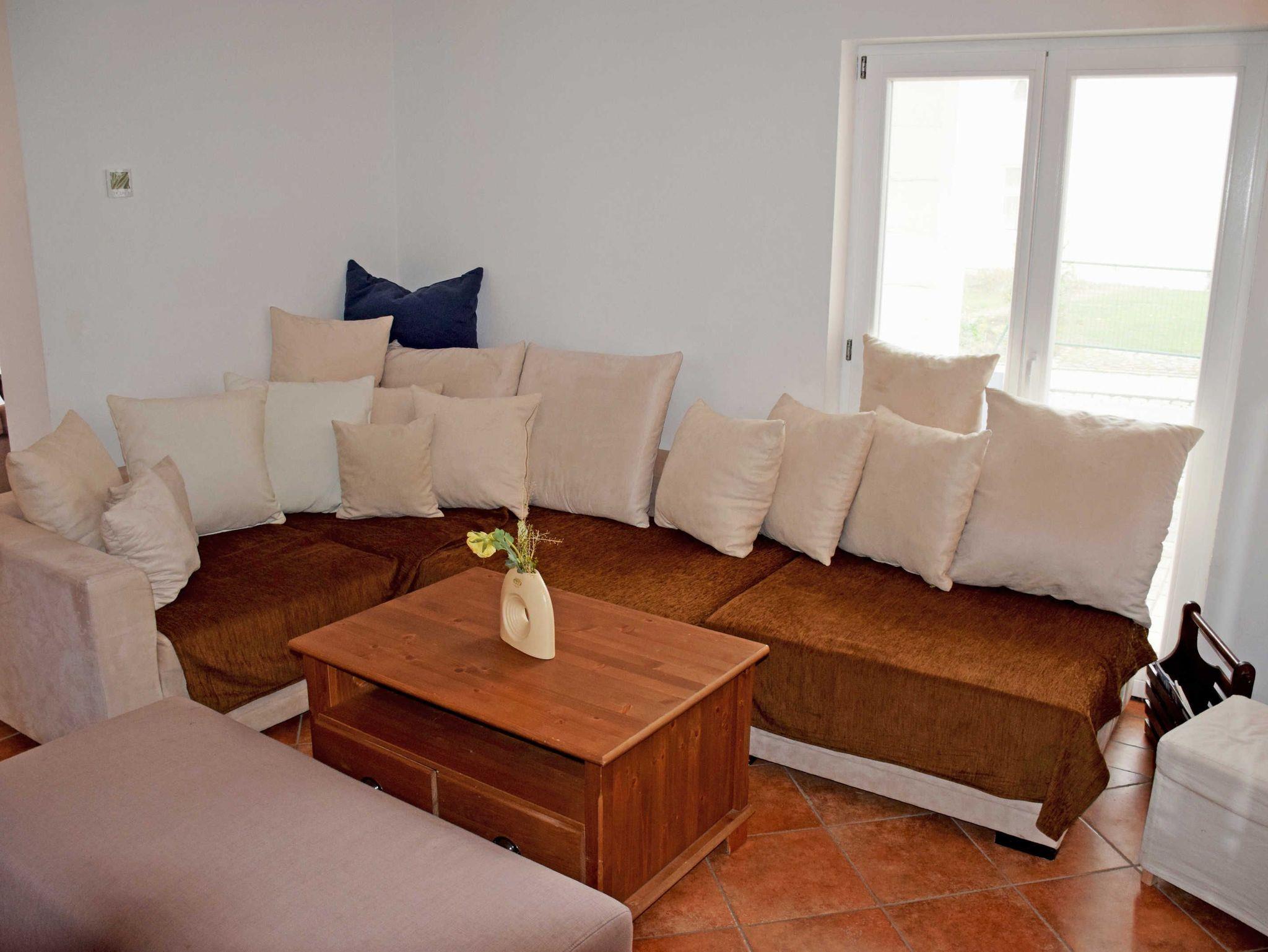 Wohnbereich in Form einer Veranda mit kleinem Tisch und 2 Lounge-Sesseln, großer Kommode sowie Esstisch mit 4 Stühlen.