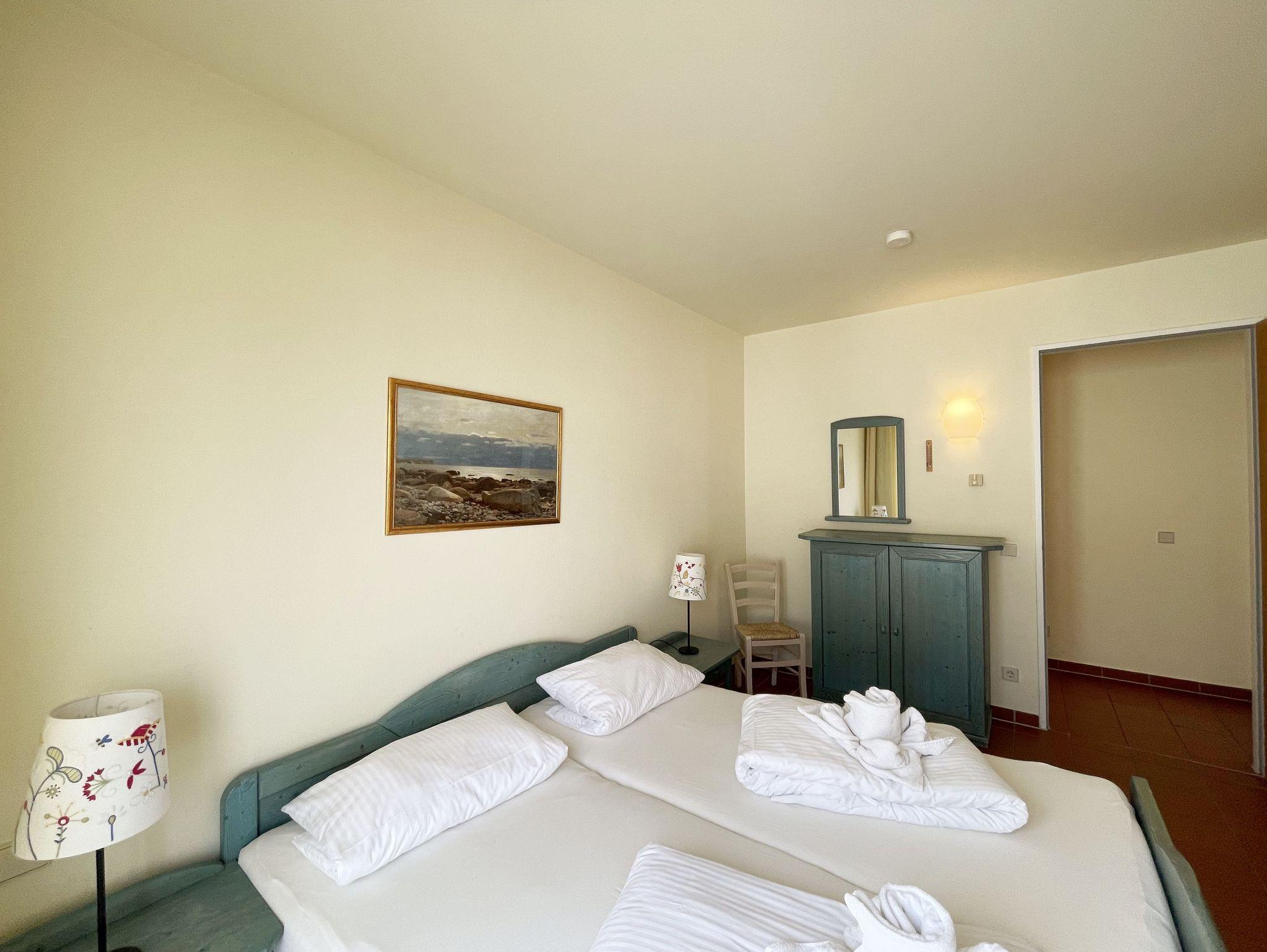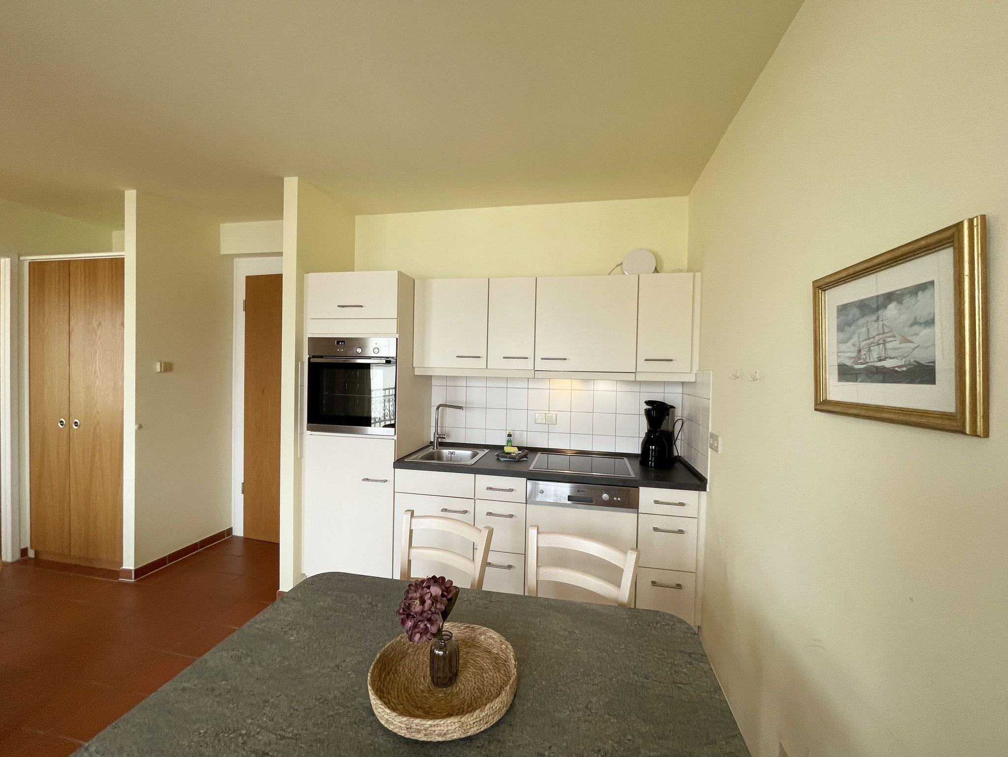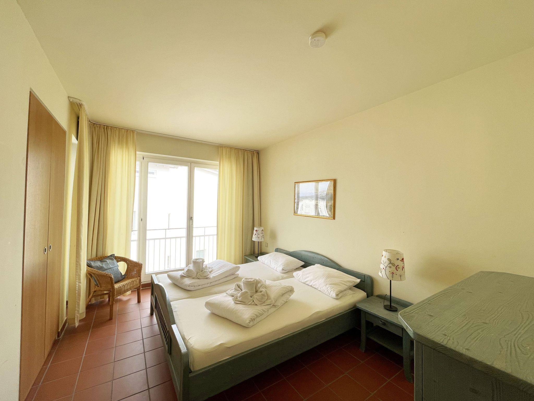 Die geräumige, nach Nord-Ost ausgerichtete 3-Zimmerwohnung ist etwa 55 qm groß und befindet sich im ersten Obergeschoss. Das Appartement ist für 2 bis 6 Personen geeignet. Im Wohnbereich finden Sie eine komfortable Schlafcouch (1,60m x 1,95m), einen LED-Fernseher, einen Essplatz für 6 Personen sowie die Küchenzeile. Sie ist mit Cerankochfeld, Spülmaschine, Backofen, Kaffeemaschine, Wasserkocher, Toaster, Kühlschrank mit Eisfach und allen wichtigen Küchenutensilien ausgestattet. An den Wohnbereich grenzt der bestuhlte Balkon. Das gemütliche Schlafzimmer verfügt über ein Doppelbett (2 x 0,90 x 2,00 m) mit 7-Zonen-Matratzen, einen Kleiderschrank und eine Kommode mit Spiegel. Im zweiten, kleineren Schlafzimmer finden Sie ein Kojenbett ( 2 x 0,80 x 2,00 m), ebenso einen Kleiderschrank und eine Kommode mit Spiegel. Das Bad ist mit WC, Waschbecken und Föhn ausgestattet. Die geräumige Dusche ist ebenerdig zu begehen und mit Glaswänden abgetrennt. In der kühleren Jahreszeit wärmt die angenehme Fußbodenheizung in allen Räumen den Terracottaboden. Auch im Urlaub brauchen Sie auf einen WLAN-Zugang nicht verzichten. Dieser ist für Sie inklusive vorhanden. Ein eigener Stellplatz Nr. 24 für Ihr Fahrzeug befindet sich hinter dem Haus. In einem separaten Raum können mitgebrachte oder geliehene Fahrräder abgeschlossen werden. Auch 1 Vierbeiner ist gegen eine Gebühr ein gern gesehener Gast. Die Erstausstattung eines Wäschepaketes (komplette Bettwäsche, 1 Duschhandtuch, 1 kleines Handtuch) können Sie bis 14 Tage vor Anreise dazu buchen oder durch eigene ergänzen. Ab 2 gebuchten Paketen erhalten Sie einmalig 1 Geschirrhandtuch und 1 Duschvorleger hinzu.