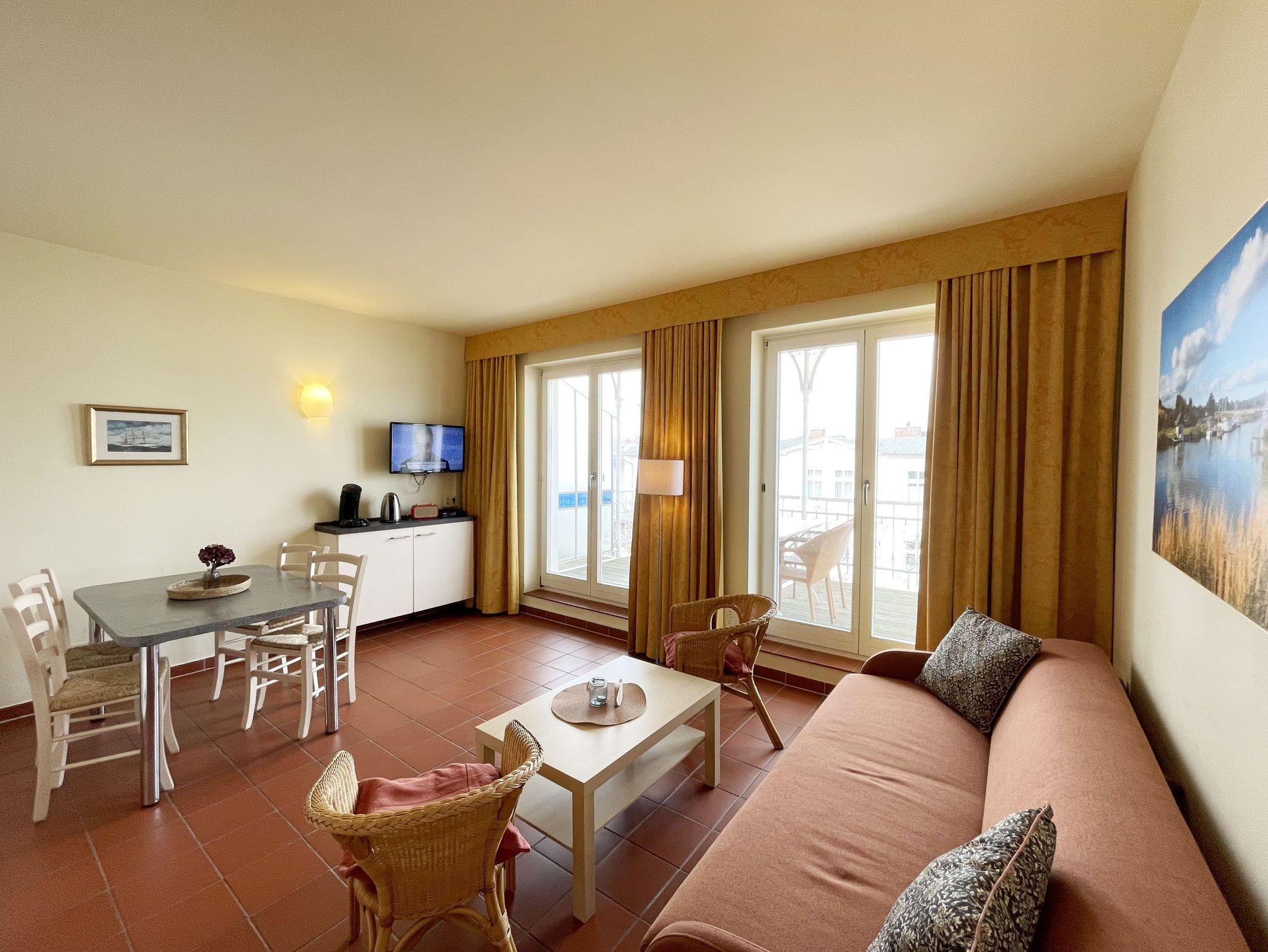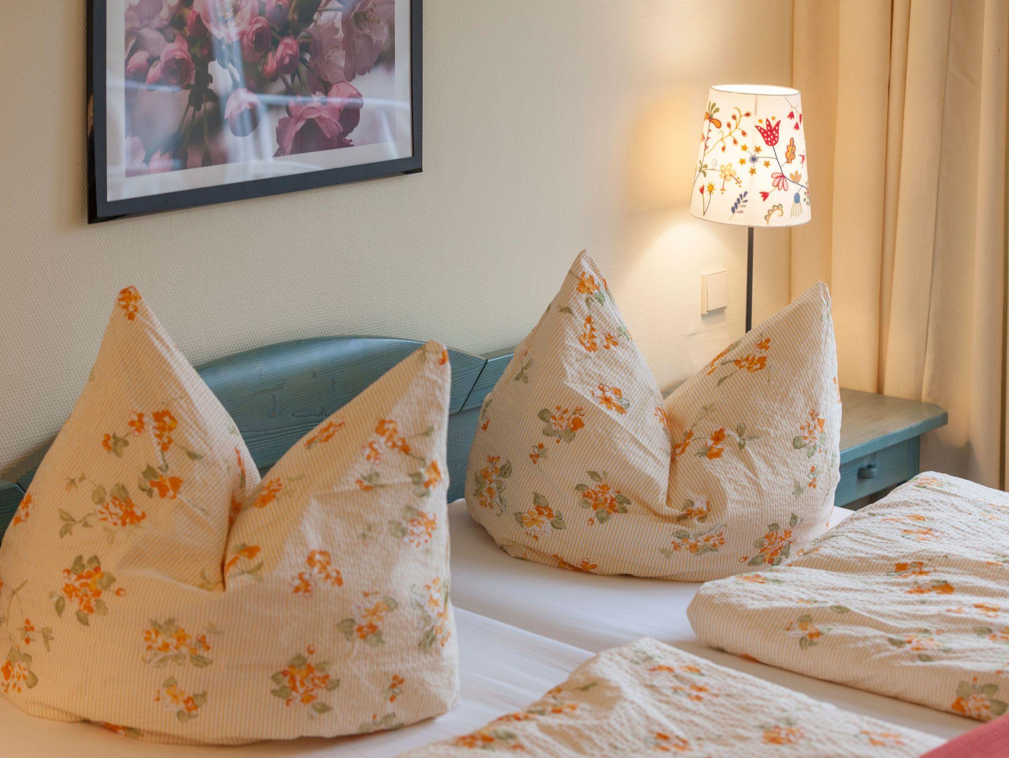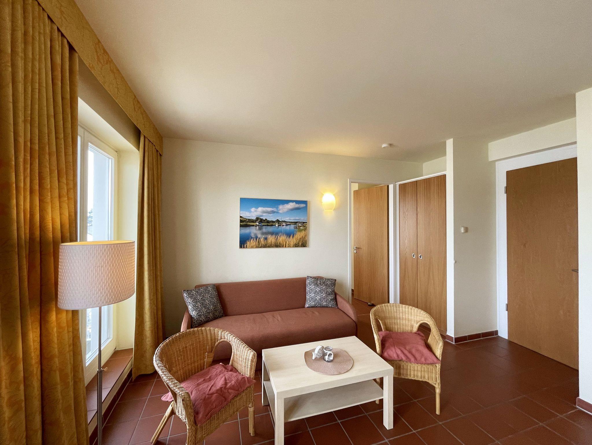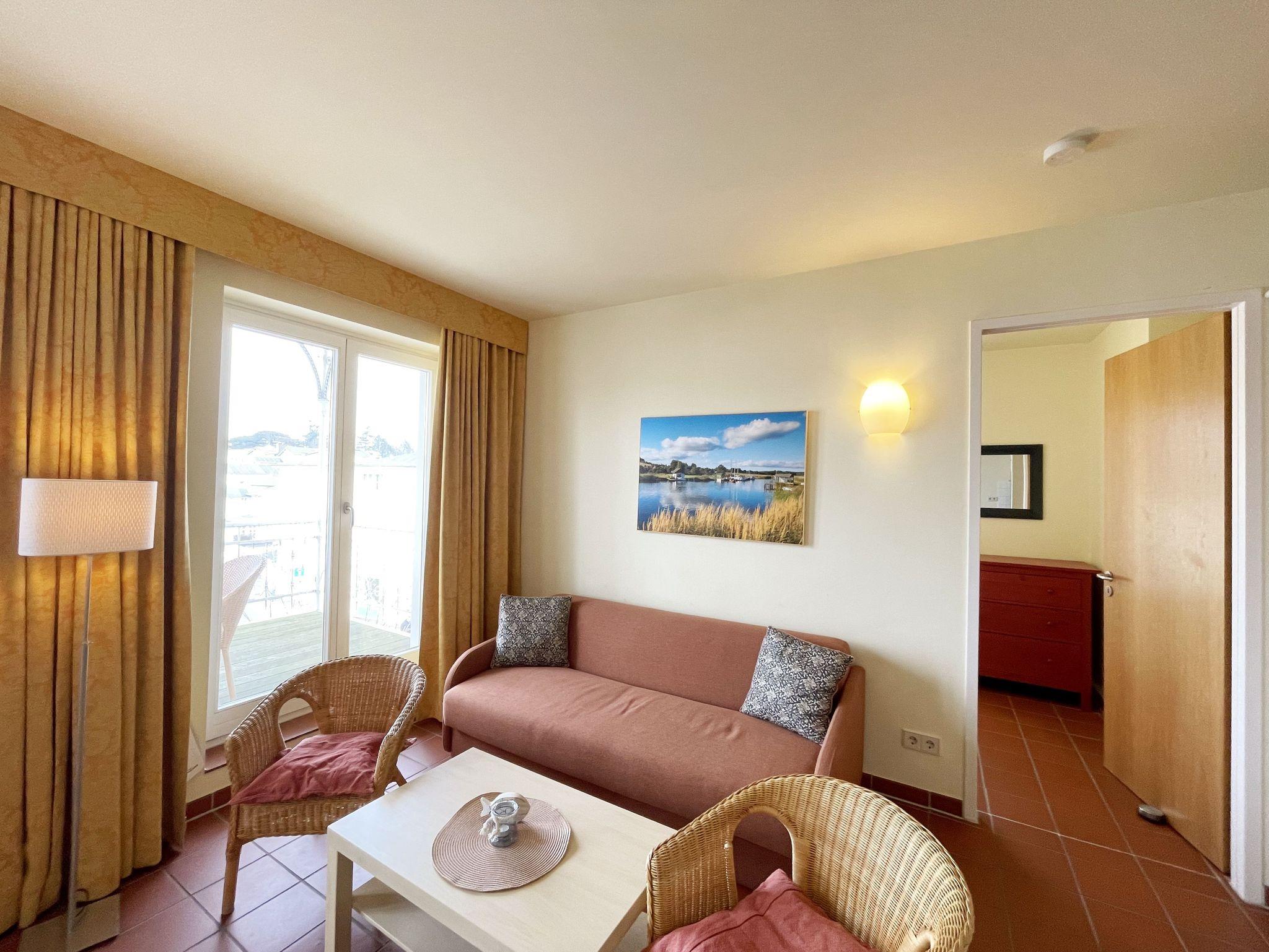 Die geräumige, nach Nord-Ost ausgerichtete 3-Zimmerwohnung ist etwa 55 qm groß und befindet sich im ersten Obergeschoss. Das Appartement ist für 2 bis 6 Personen geeignet. Im Wohnbereich finden Sie eine komfortable Schlafcouch (1,60m x 1,95m), einen LED-Fernseher, einen Essplatz für 6 Personen sowie die Küchenzeile. Sie ist mit Cerankochfeld, Spülmaschine, Backofen, Kaffeemaschine, Wasserkocher, Toaster, Kühlschrank mit Eisfach und allen wichtigen Küchenutensilien ausgestattet. An den Wohnbereich grenzt der bestuhlte Balkon. Das gemütliche Schlafzimmer verfügt über ein Doppelbett (2 x 0,90 x 2,00 m) mit 7-Zonen-Matratzen, einen Kleiderschrank und eine Kommode mit Spiegel. Im zweiten, kleineren Schlafzimmer finden Sie ein Kojenbett ( 2 x 0,80 x 2,00 m), ebenso einen Kleiderschrank und eine Kommode mit Spiegel. Das Bad ist mit WC, Waschbecken und Föhn ausgestattet. Die geräumige Dusche ist ebenerdig zu begehen und mit Glaswänden abgetrennt. In der kühleren Jahreszeit wärmt die angenehme Fußbodenheizung in allen Räumen den Terracottaboden. Auch im Urlaub brauchen Sie auf einen WLAN-Zugang nicht verzichten. Dieser ist für Sie inklusive vorhanden. Ein eigener Stellplatz Nr. 24 für Ihr Fahrzeug befindet sich hinter dem Haus. In einem separaten Raum können mitgebrachte oder geliehene Fahrräder abgeschlossen werden. Auch 1 Vierbeiner ist gegen eine Gebühr ein gern gesehener Gast. Die Erstausstattung eines Wäschepaketes (komplette Bettwäsche, 1 Duschhandtuch, 1 kleines Handtuch) können Sie bis 14 Tage vor Anreise dazu buchen oder durch eigene ergänzen. Ab 2 gebuchten Paketen erhalten Sie einmalig 1 Geschirrhandtuch und 1 Duschvorleger hinzu.