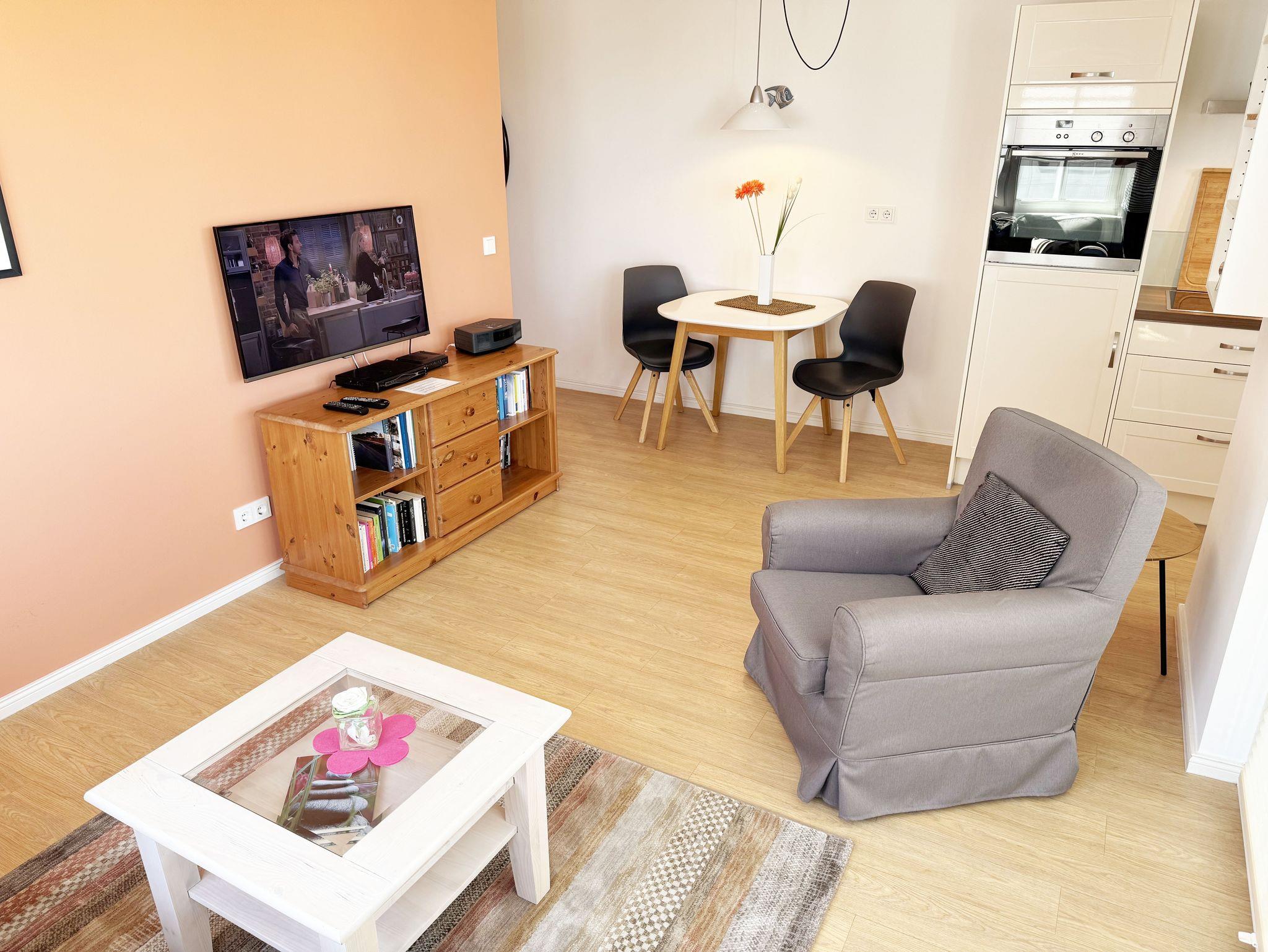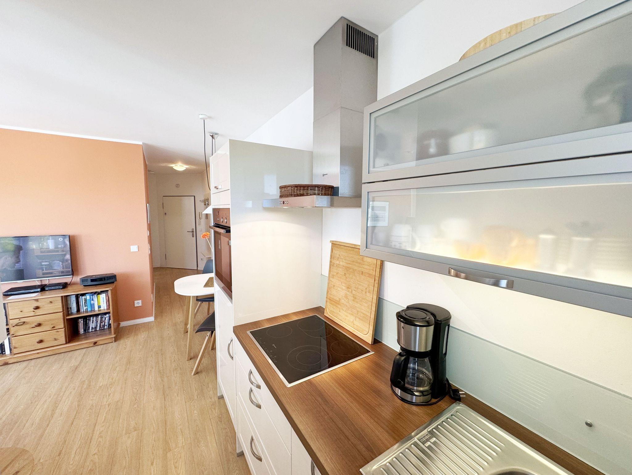 Vom großzügigen und bestuhlten Balkon der Wohnung 12 in der Villa Antje haben Sie einen Blick über das Ostseebad Göhren und sehen am Horizont sogar ein wenig die Ostsee. Bis zum Mittag kann man auf dem Balkon die Sonne genießen, dann ist es ohnehin Zeit, sich auf den Weg zu den schönen Stränden und Ausflugsziele von Göhren und der Umgebung zu machen. Die etwa 45 qm große 2-Raumwohnung (Nichtraucher) bietet allen Komfort, den man von einer modernen Ferienwohnung erwarten darf. Eine komplett eingerichtete Küchenzeile mit Geschirrspüler, 4-Zonen-Ceranfeld, Backofen mit Grill, Kühlschrank mit Eisfach, Kaffeemaschine, Toaster und Wasserkocher lassen beim Kochen keine Wünsche offen. Der angrenzende Wohnbereich rundet mit einem Flachbildfernseher, Mini-Stereo-Anlage, einer modernen Couchecke mit Sessel, Couchtisch, Leselampe sowie einem Sideboard den Wohnbereich ab. Große Fenster sorgen für viel Licht; sollten doch einmal ein paar trübe Tage dabei sein, steht Ihnen eine feine und kleine Auswahl an Büchern und Filmen bereit. Das Bad ist elegant, die Dusche großzügig und wird zusammen mit dem WC, Fön und Waschtisch abgerundet. Der separate Schlafbereich mit einem Doppelbett (2 x 0,90 m x 2,00 m), Nachtischkonsolen, Flachbild-TV und Kleiderschrank bieten Ihnen einen angenehmen Schlaf. Ein hauseigener Fahrstuhl bringt Sie von Ihrem Tiefgaragenstellplatz (Nr. 12, Einfahrtshöhe 2.00m) bis in die 1. Etage, wo sich Ihre Wohnung befindet. Ein separater Abstellraum für Ihre eigenen Fahrräder sowie ein allgemeiner Waschraum mit Waschmaschine und Trockner gegen Gebühr kann von allen Hausgästen genutzt werden. Ein kostenfreier Internetzugang (WLAN) steht Ihnen während Ihres Urlaubs zur Verfügung. 1 Haustier ist gegen eine Gebühr willkommen. Wir erwarten aber, dass ein eigener Schlafplatz von zu Hause mitgebracht wird. Auch für unseren eigenen Hund sind Sofa und Schlafzimmer tabu. Die Erstausstattung eines Wäschepaketes (komplette Bettwäsche, 1 Duschhandtuch, 2 kleine Handtücher, 2 Geschirrhandtücher) können Sie bis 14 Tage vor Anreise gegen einen Aufpreis dazu buchen oder durch eigene ergänzen.