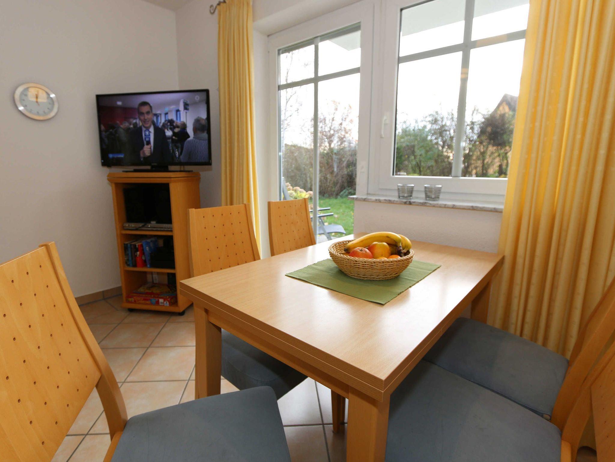 Die lichtdurchflutete, komfortable Nichtraucherwohnung verläuft auf über 61 m² und ist ideal für 2 bis 4 Personen geeignet. Ein Kleinkind (3 Jahre) im Kinderreisebett kann als Aufbettung (5. Person) untergebracht werden. Die beiden Terrassen (Richtung Osten und Süden) laden zum Verweilen ein und erlauben es Ihnen den ganzen Tag die mitwandernde Sonne zu genießen. Der kombinierte Wohn- und Essbereich ist mit einer hellen Küchenzeile ausgestattet. Die Küchenzeile beinhaltet ein Ceranfeld, Backofen, Geschirrspüler, Mikrowelle, Kühlschrank mit Gefrierfach, Kaffeemaschine, Senseo Kaffeeautomat, Toaster, Wasserkocher sowie diverse Küchenutensilien. Der dazugehörige Essbereich umfasst einen Esstisch mit 4 Stühlen. Ein Wohnbereich mit Sofa, Sessel, Couchtisch, Vitrine, Leselampe, Flatscreen-TV mit DVD-Player, Stereoanlage mit CD-Player sowie eine kleine Auswahl an Gesellschaftsspielen runden das Ganze ab. Das 1. Schlafzimmer ist mit einem Doppelbett (1,60 m x 2,00 m), verstellbaren Lattenrosten, 2 Nachtschränken, einen Flachbild-TV und Kleiderschrank ausgestattet. Von hier aus haben Sie Blick auf das Naturschutzgebiet. Das 2. Schlafzimmer verfügt ebenfalls über ein Doppelbett (1,40 m x 2,00 m) und 2 Nachtschränke sowie eine Kommode. Für einen ruhigen Schlaf sorgen in beiden Schlafzimmern Rollläden. Das Bad ist mit einer Dusche mit flachem Einstieg, Fön, WC und Waschtisch ausgestattet. Auch im Urlaub brauchen Sie auf einen Internetzugang (WLAN über Hotspot) in Ihrer Wohnung nicht zu verzichten. Dieser ist inklusive. 1x Kinderreisebett (ohne Matratze und Bett Inlett) ist für unsere kleinen Gäste inklusive. Ein Hochstuhl kann gegen eine Extragebühr dazu gebucht werden. 1 Haustier ist mit seinem eigenen Schlafplatz ein gern gesehener Gast. In einem Gemeinschaftsraum können Sie gegen einen Aufpreis eine Waschmaschine und einen Trockner nutzen. Der Parkplatz (Nr. 1) befindet sich direkt auf dem Grundstück. Ihre Fahrräder können Sie auf dem Areal in einen Fahrradschuppen unterstellen. Ein Gemeinschaftsgrillplatz mit massiven Holzbänken und Standgrill ist vorhanden. Die Erstausstattung eines Wäschepaketes (komplette Bettwäsche, 1 Duschhandtuch, 2 kleine Handtücher) können Sie bis 14 Tage vor Anreise gegen einen Aufpreis dazu buchen oder durch eigene ergänzen. Ab 2 gebuchten Paketen erhalten Sie einmalig 1 Geschirrhandtuch und 1 Duschvorleger hinzu.