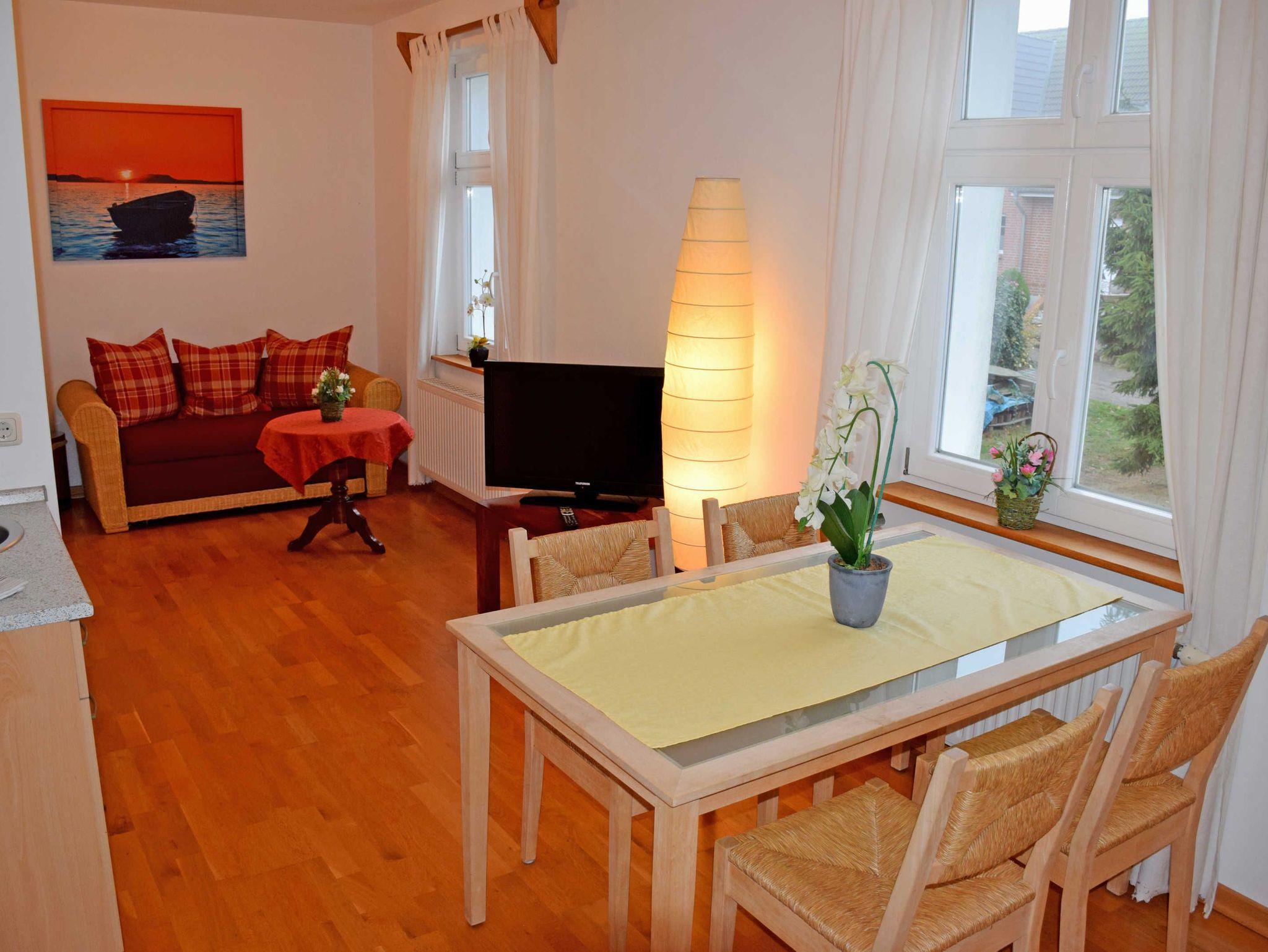 Wohnfläche ca. 35 m² für max. 2 Personen sowie einem Kleinkind bis 3 Jahren. Sollten Sie ein KInderreisebett wünschen, bitten wir Sie dieses bei Buchung mit anzugeben. Der Wohnraum ist ausgestattet mit ausziehbarer Couch, Couchtisch, Flat-TV 32, Esstisch mit 4 Stühlen.