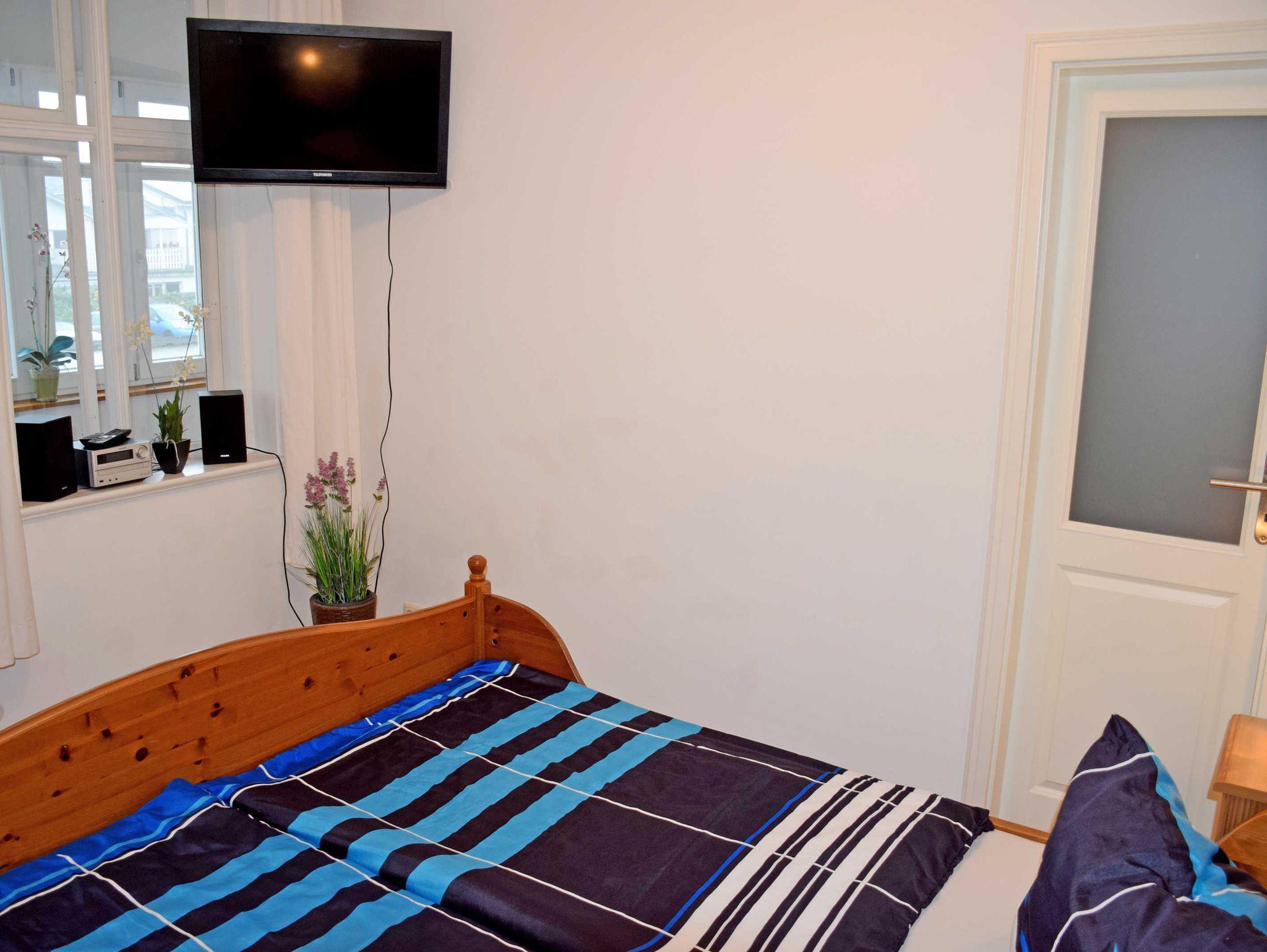 1 offenes Schlafzimmer mit Doppelbett (180 x 200 cm), Nachttischen und Flat-TV 32 sowie CD-Radio-Anlage.