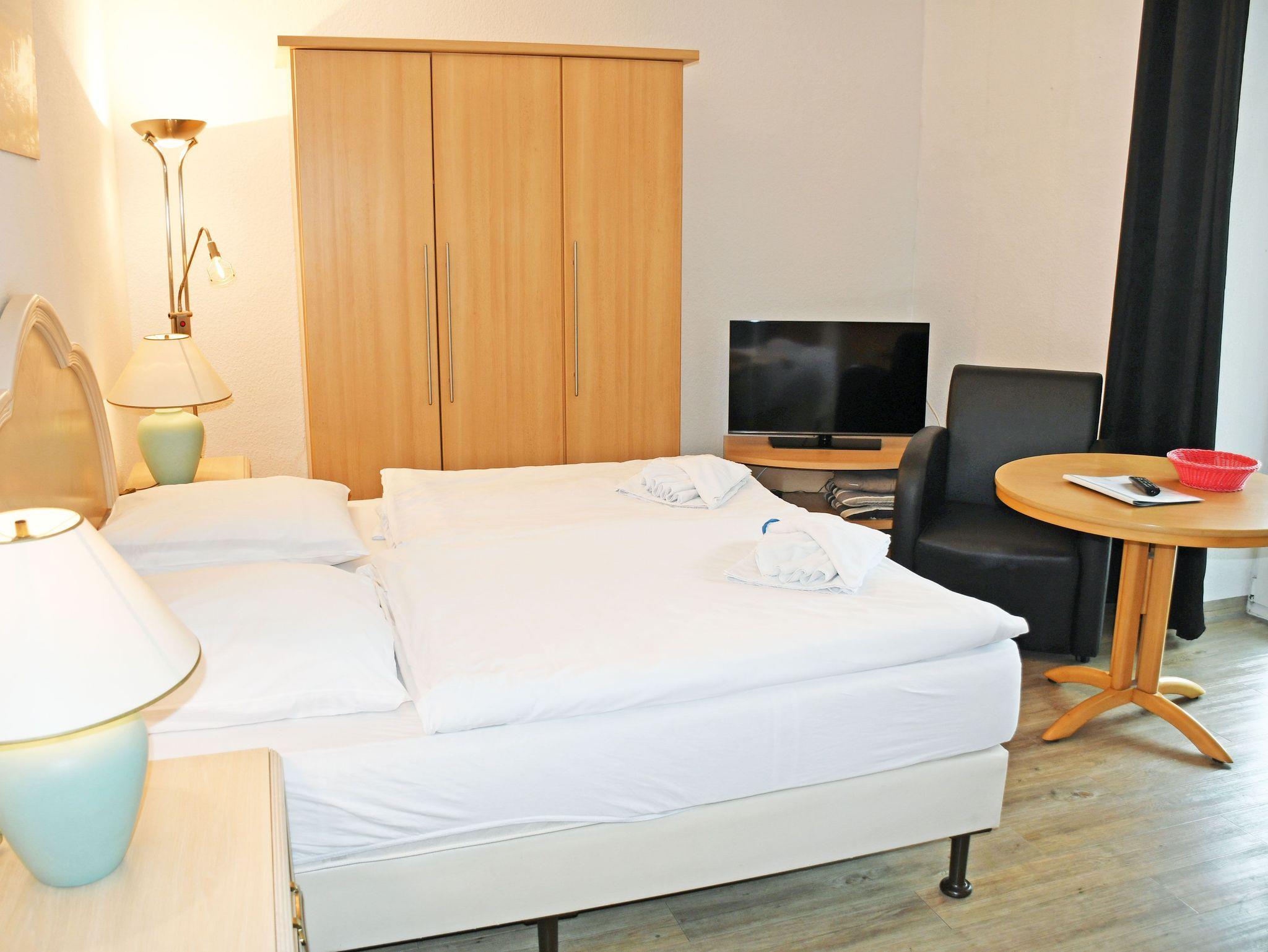 kombinierter Wohn-/Schlafraum mit Doppelbett (180 x 200 cm), Nachttischen, großem Kleiderschrank, Tisch mit 2 Ledersesseln, Anrichte mit TV, Kofferablage