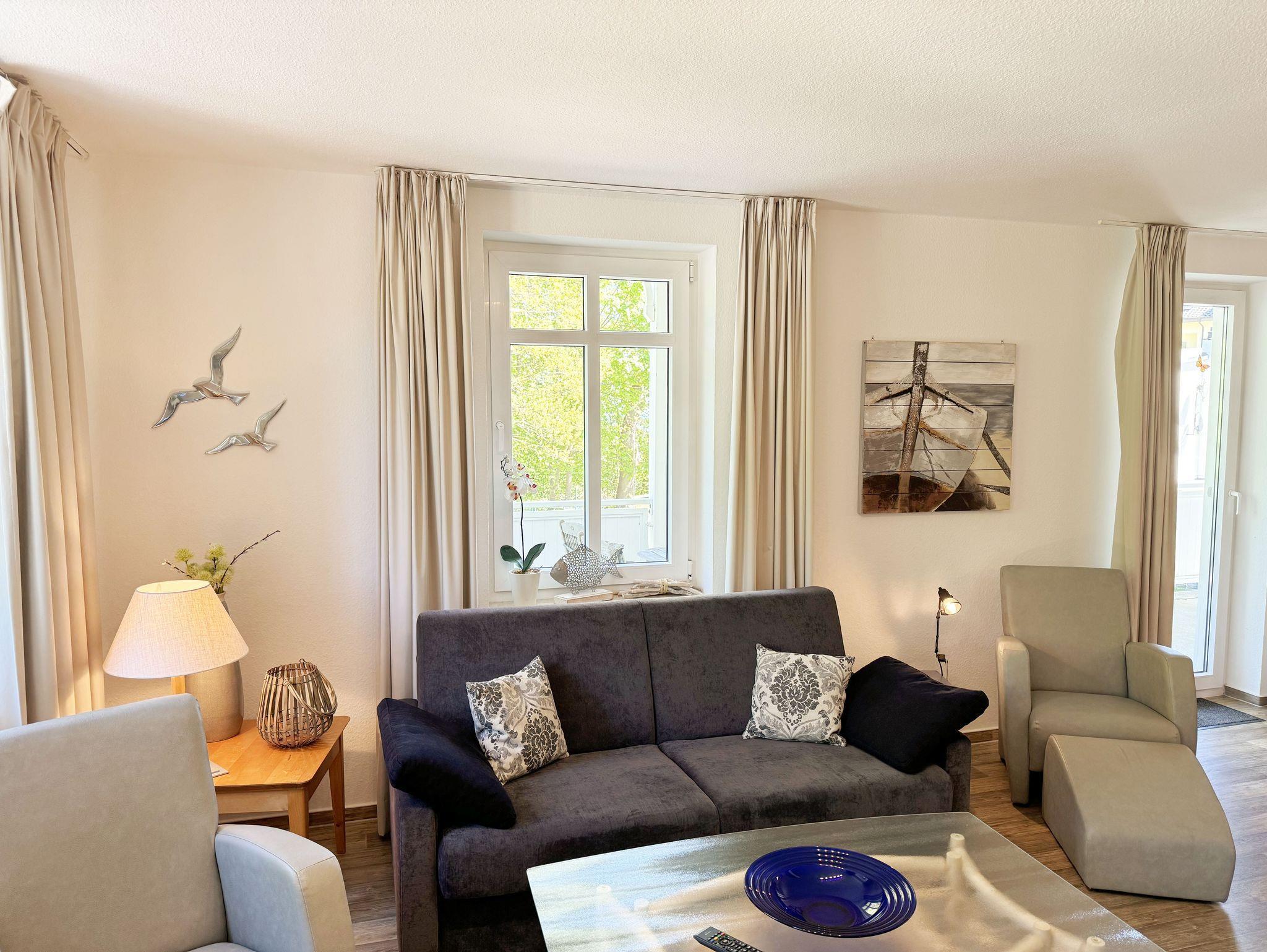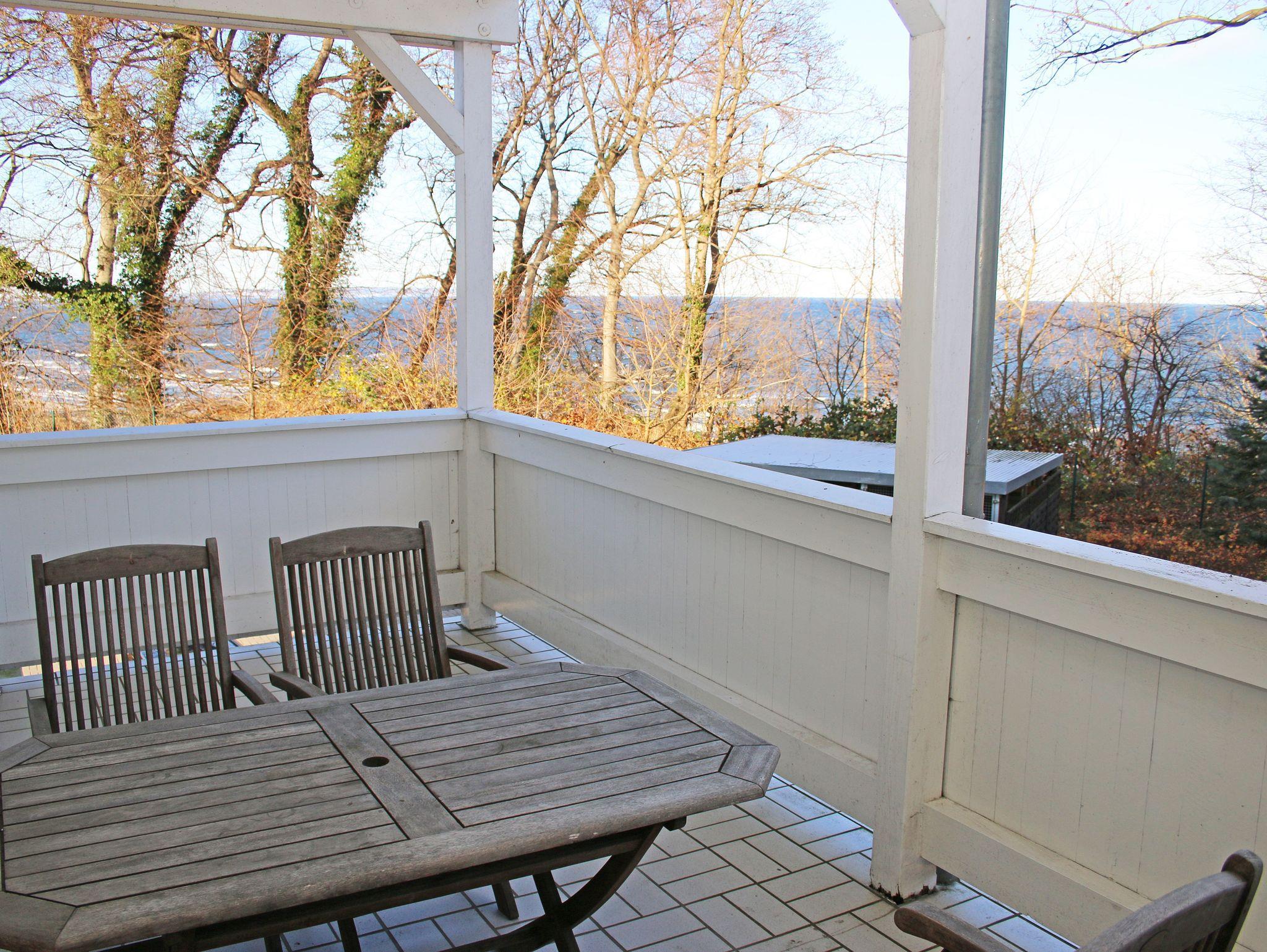 Die 2-Raumferienwohnung ist als Nichtraucher deklariert und befindet sich im 1. Obergeschoss des Hauses. Mit Ihren ca. 60 qm Wohnfläche bietet Sie ausreichend Platz für 2 - 4 Personen. Die Ferienwohnung ist komfortabel und geschmackvoll eingerichtet. Der Wohnbereich verfügt über eine Couchecke mit Ausziehfunktion (Aufbettung 3. und 4. Person, 1,80m x 2,00m), Couchtisch und Sideboard, Leselampe, mit Smart-TV, Radio + CD-Player. Die angrenzende Küchenzeile mit Esstisch ist komplett ausgestattet mit Geschirrspüler, Backofen mit 4-Zonen-Ceranfeld, Mikrowelle, Kühlschrank mit Eisfach, Kaffeemaschine, Toaster, Wasserkocher sowie diversen Küchenutensilien. Das Badezimmer umfasst eine Dusche, WC, Fön und Waschtisch. Das separate Schlafzimmer mit einem Doppelbett (0,90 x 1,80 m) mit Nachtischkonsolen und geräumigen Kleiderschrank rundet die Ferienwohnung ab. Zu den Highlights der Wohnung gehören der große überdachte Balkon und der traumhafte Blick auf die Steilküste und das Meer (im Sommer eingeschränkt durch die Blätter des alten Baumbestandes am Hang). Auch in Ihrem Urlaub brauchen Sie auf einen Internetzugang (WLAN) nicht verzichten, dieser ist vorhanden und inklusive. Ein PKW-Stellplatz ist direkt vor dem Haus. Ihre mitgebrachten oder auch vor Ort geliehenen Fahrräder können Sie im Abstellraum unterstellen. Haustiere sind in der Wohnung nicht erlaubt. Die Erstausstattung eines Wäschepaketes (komplette Bettwäsche, 1 Duschhandtuch, 1 kleines Handtuch) können Sie bis 14 Tage vor Anreise gegen einen Aufpreis dazu buchen oder durch eigene ergänzen. Ab 2 gebuchten Paketen erhalten Sie einmalig 1 Geschirrhandtuch und 1 Duschvorleger hinzu.
