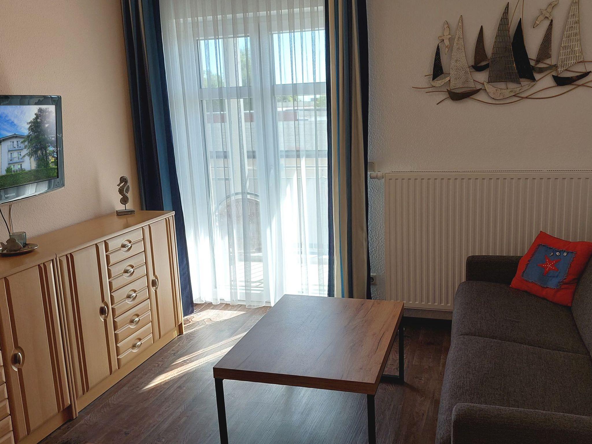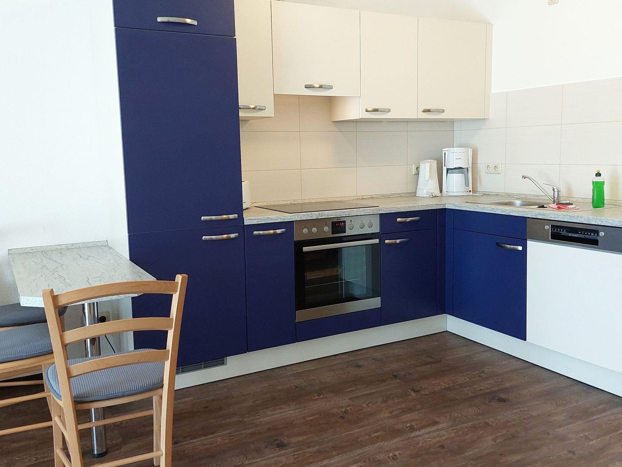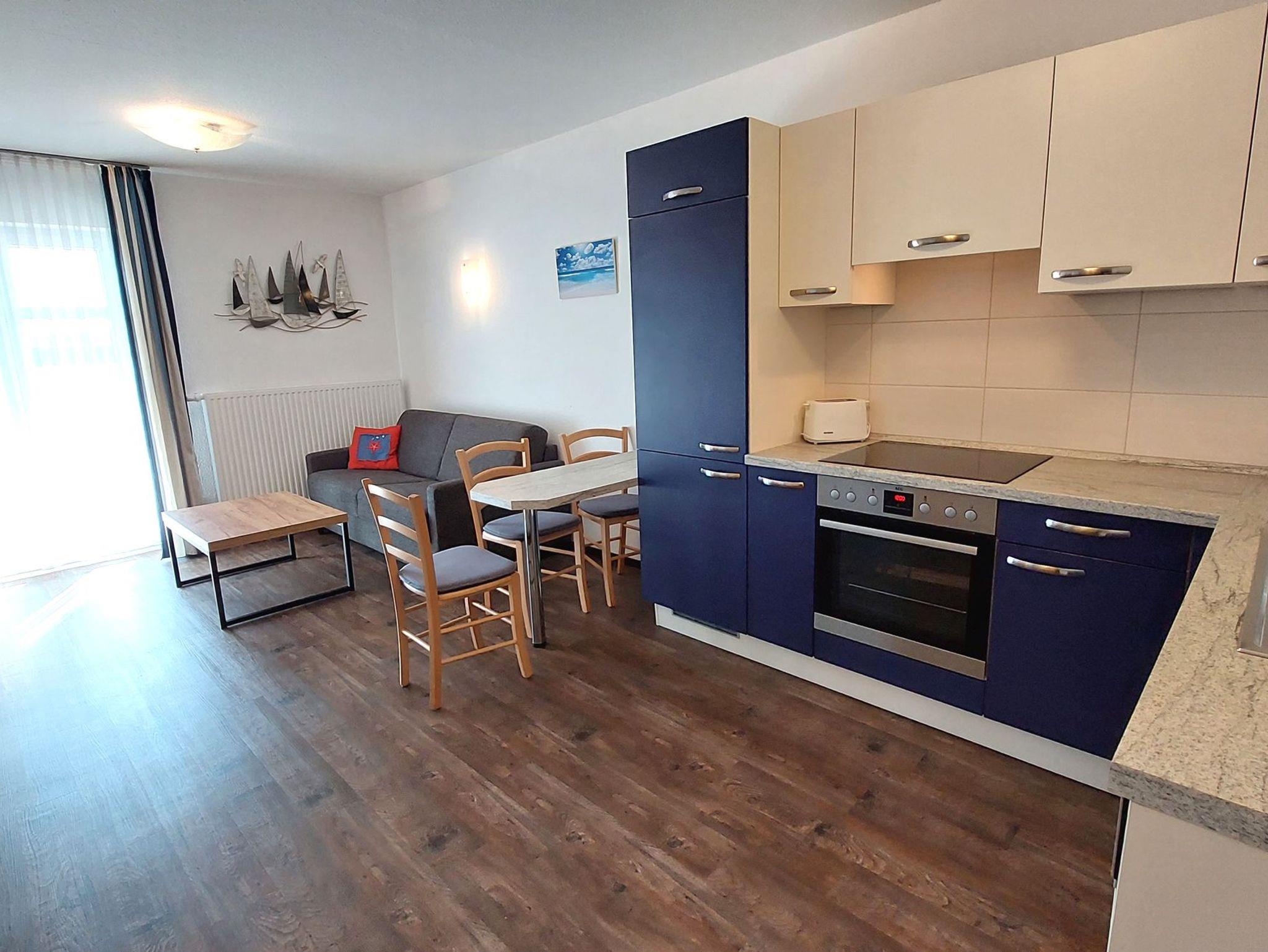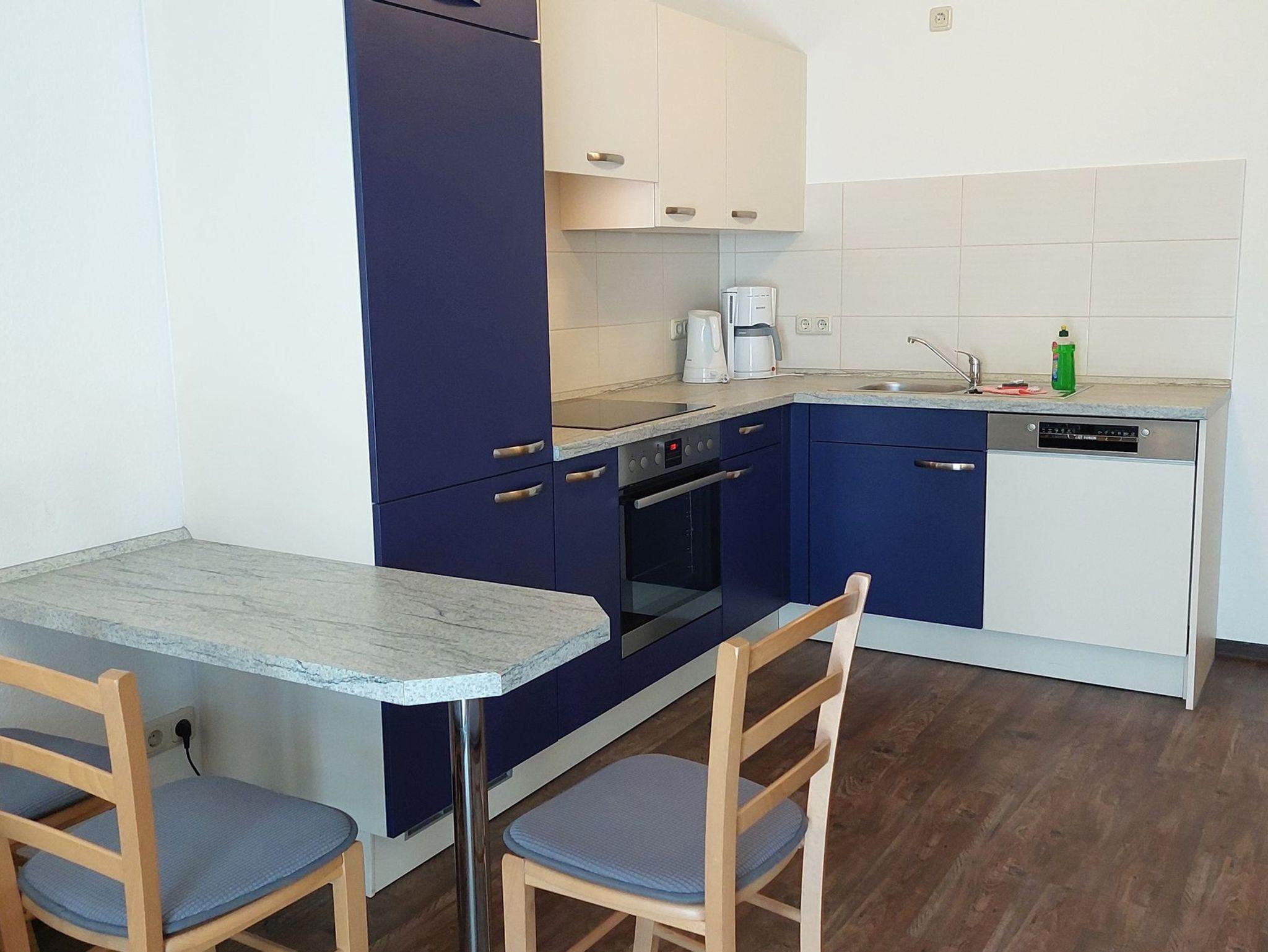 Diese freundliche Wohnung ist aufgeteilt in einen Wohnraum mit Balkon und integrierter Küchenzeile, ein Schlafzimmer ebenso mit Zugang zum Balkon und ein Duschbad mit Waschtisch und WC. Das Wohnzimmer begrüßt Sie mit einem Schlafsofa und Sessel sowie Flachbild-TV. Das Schlafzimmer verfügt über ein Doppelbett (1,80m x 2m) sowie einen Kleiderschrank. Die Küchenzeile ist mit Backofen, Geschirrspüler, Cerankochfeld, Kühlschrank mit kleinem Gefrierfach, Cerankochfeld, Mikrowelle, Kaffeemaschine, Wasserkocher und Toaster ausgestattet. Highlights: Kostenfreies WLAN sowie ein frei wählbarer PKW-Stellplatz direkt am Haus.