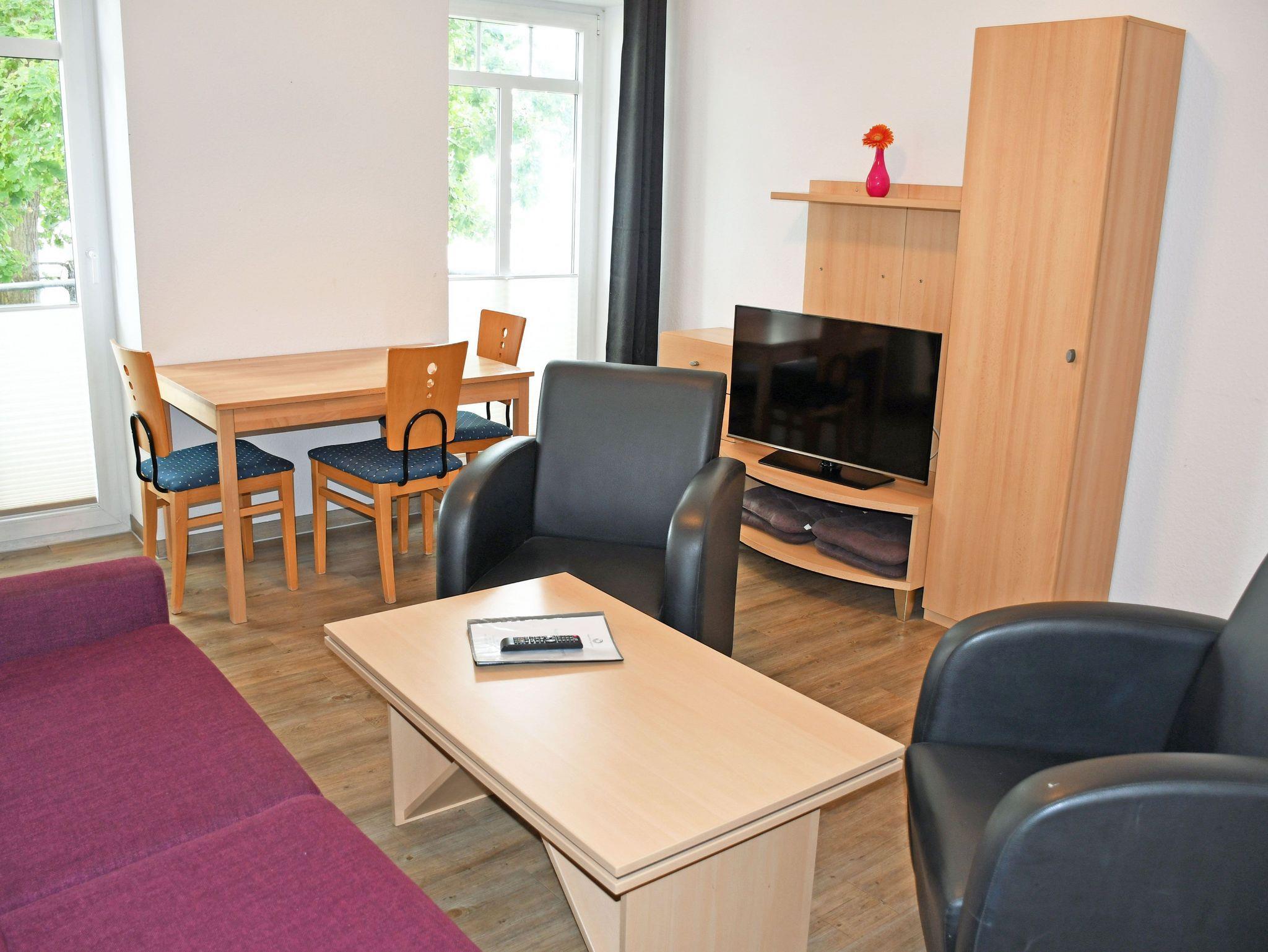 Wohnbereich mit ausziehbarer, moderner Doppelbettschlafcouch (168 x 200 cm), 2 Sesseln, Couchtisch, Anrichte mit Flat-TV (integr. Radiofunktion) und Esstisch mit 4 Stühlen