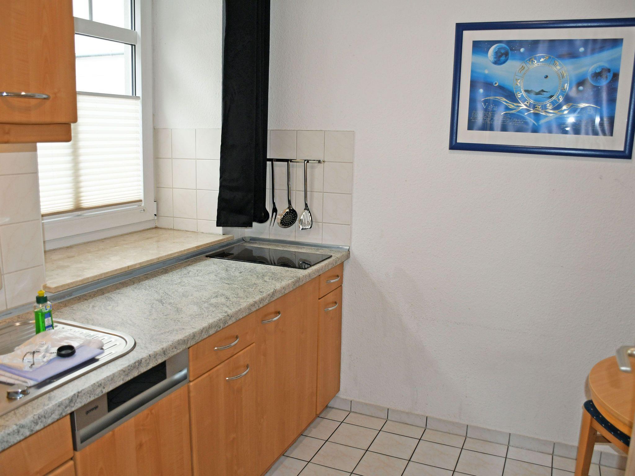 Im Wohnraum integrierte Einbauküche, ausgestattet mit: 2-Platten-Kochfeld, Dunstabzugshaube, großer Kühlschrank mit Gefrierfach, Geschirrspüler, Toaster, Kaffeemaschine, Wasserkocher und Küchenutensilien