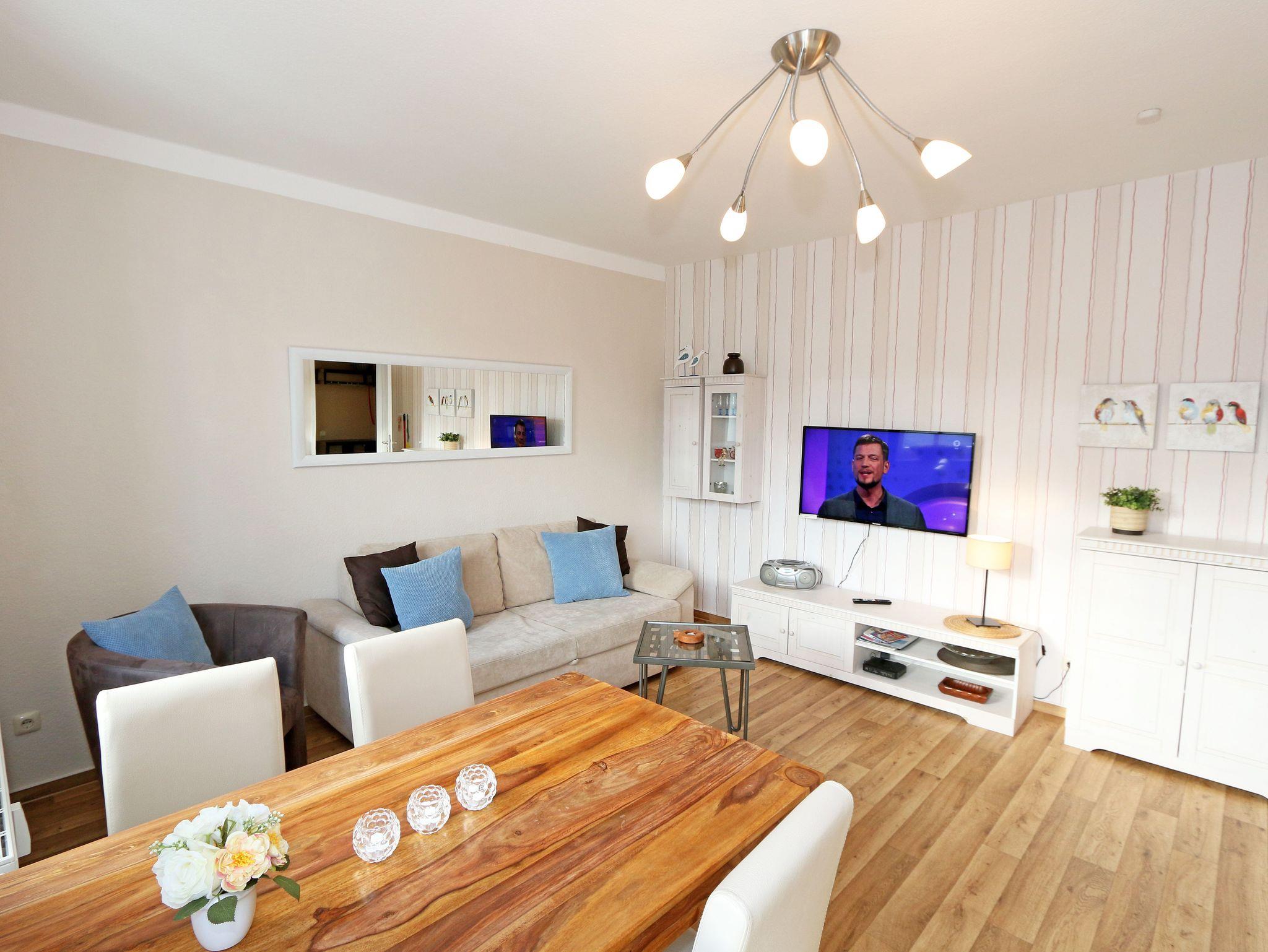 Die Ferienwohnung 09 des Hauses Strandmuschel ist eine komfortable Nichtraucherwohnung, welche sich in der 2. Etage befindet. Die 2-Zimmer Wohnung umfasst etwa 40m² und bietet somit ausreichend Platz für bis zu 4 Personen. Sie setzt sich zusammen aus einem Wohnbereich mit Balkon, einem Schlafzimmer und schließlich dem Badezimmer. Der Wohnbereich ist liebevoll und detailreich eingerichtet. Im dem lichtdurchfluteten Raum finden sie, neben einem Sessel sowie einem Couchtisch, ein bequemes Schlafsofa (1,40m x 2,00m), welches als Schlafmöglichkeit für 2 Personen geeignet ist. Ein Flachbild-TV sowie ein DVD-Player ermöglichen es ihnen, nach einem eindrucksvollen Tag einen gemütlichen Filmeabend mit den Liebsten zu verbringen. Auch ein Radio mit CD-Player und verschiedene Lektüren für die Bücherwürmer unter ihnen sind vorzufinden. Auf einen Internetzugang (WLAN) brauchen Sie nicht verzichten. Dieser ist für Sie inklusive. Die Küchenzeile im gleichen Raum ist mit einem Ceranfeld ausgestattet. Sie enthält, neben einem Backofen und einem Kühlschrank mit Eisfach, einen Geschirrspüler, eine Mikrowelle, einen Wasserkocher, einen Toaster, eine Kaffeemaschine und diverse Kochutensilien. Komplettiert wird der Wohnbereich durch einen Esstisch mit vier Stühlen sowie dem Zugang zum Balkon (Süd/Ost). Dieser umfasst knapp 7 m². Auch hier finden sie einen Tisch mit vier Stühlen sowie einen Sonnenschirm. Der Balkon (Süd/Ost) ist seitlich zum Meer ausgerichtet und tragen die Bäume zum Ende des Jahres keine Blätter mehr, so haben sie zumindest einen wunderbaren Blick auf das Meer. Das Schlafzimmer ist mit einem Doppelbett (1,60m x 2,00m), verstellbare Lattenroste und einem geräumigen Kleiderschrank ausgestattet. Auch ein kleiner Spiegel mit einer Ablage ist vorzufinden. Wie auch der Wohnbereich, ist das Schlafzimmer angenehm hell. Bei Bedarf können sie jedoch einfach die Vorhänge zuziehen und dunkeln den Raum somit komplett ab. Sollten sie feststellen, dass ihre Kleidung im Koffer zerknittert ist, so finden sie im Schlafzimmer sowohl ein kleines Bügelbrett als auch ein Bügeleisen vor. Abgerundet wird der Raum durch zwei Nachttischablagen mit jeweils einer Lampe sowie dekorativen Akzenten im ganzen Raum. Das Badezimmer setzt sich zusammen aus einer Dusche, einem Waschplatz, einem WC, einem beleuchteten Spiegel sowie einer Ablage. Auch ein Fön steht zur Verfügung. Natürlich ist auch an die kleinen Gäste gedacht, so dass Sie sich an verschiedenen Spielzeugen, Gesellschaftsspielen und Kinderbüchern erfreuen werden. Zusätzlich finden sie im Wohnbereich einen Kinderfahrradhelm. Ein kostenloser und mit einer Schranke gesicherter Stellplatz für Ihren PKW befindet sich direkt am Haus. Haustiere sind nicht erlaubt. Die Erstausstattung eines Wäschepaketes (komplette Bettwäsche, 1 Duschhandtuch, 2 kleine Handtücher, 2 Geschirrhandtücher) können Sie bis 14 Tage vor Anreise gegen einen Aufpreis dazu buchen oder durch eigene ergänzen.
