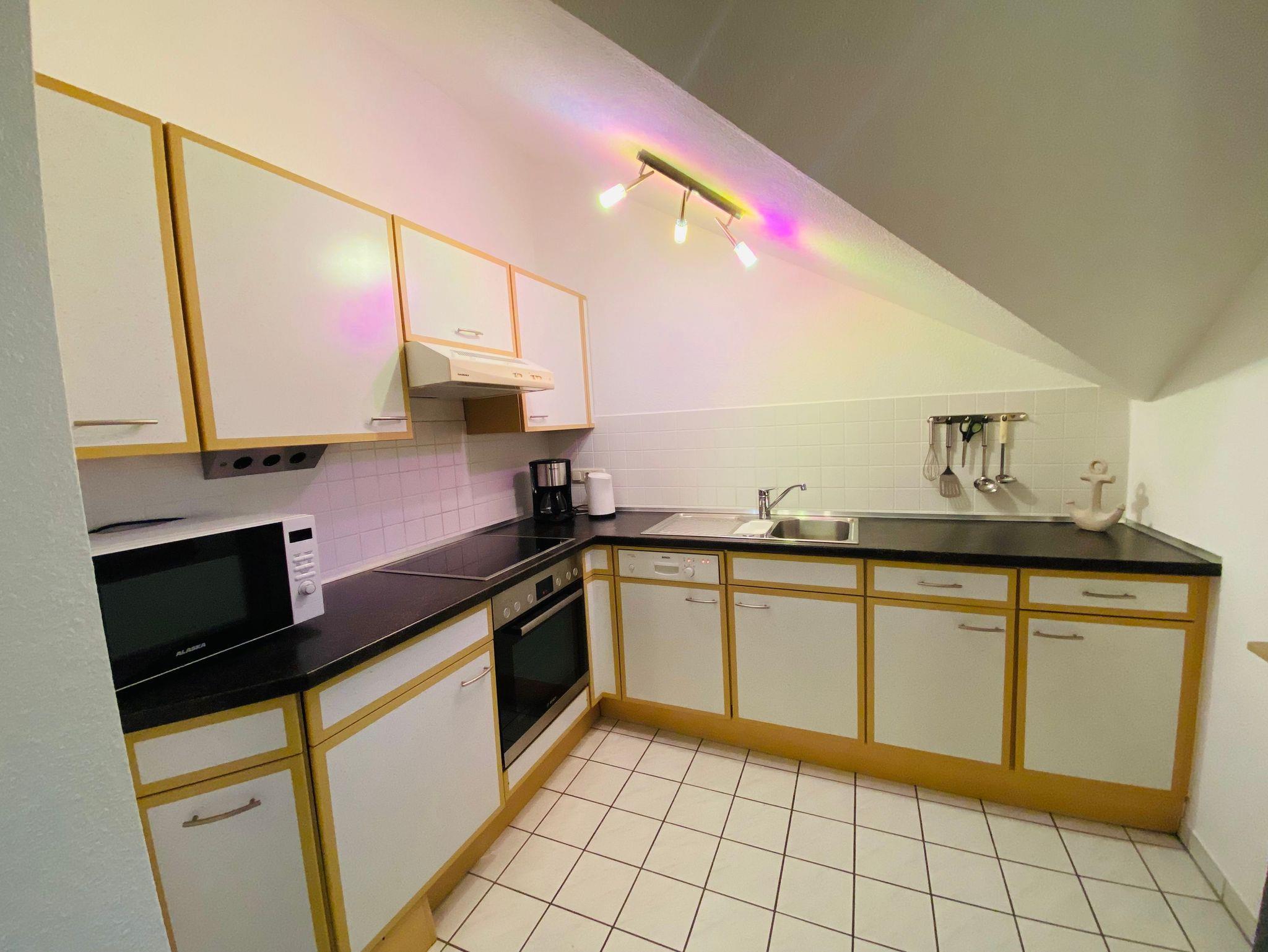 In der offenen Küche lassen sich Mahlzeiten nach Wunsch zubereiten. Hierzu steht Ihnen ein Ceranfeld mit vier Kochfeldern, eine Mikrowelle, ein Backofen, ein Kühlschrank mit Gefrierfach, eine Kaffeemaschine und ein Wasserkocher zur Verfügung.