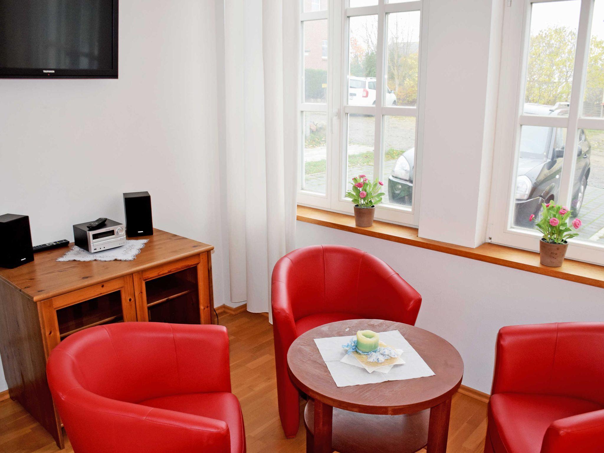 Wohnbereich mit Couchtisch, 4 Lounge-Sesseln und Flat-TV 32 im lichtdurchfluteten Erker, Esstisch mit 4 Stühlen und Anrichte mit CD-Radio-Anlage.