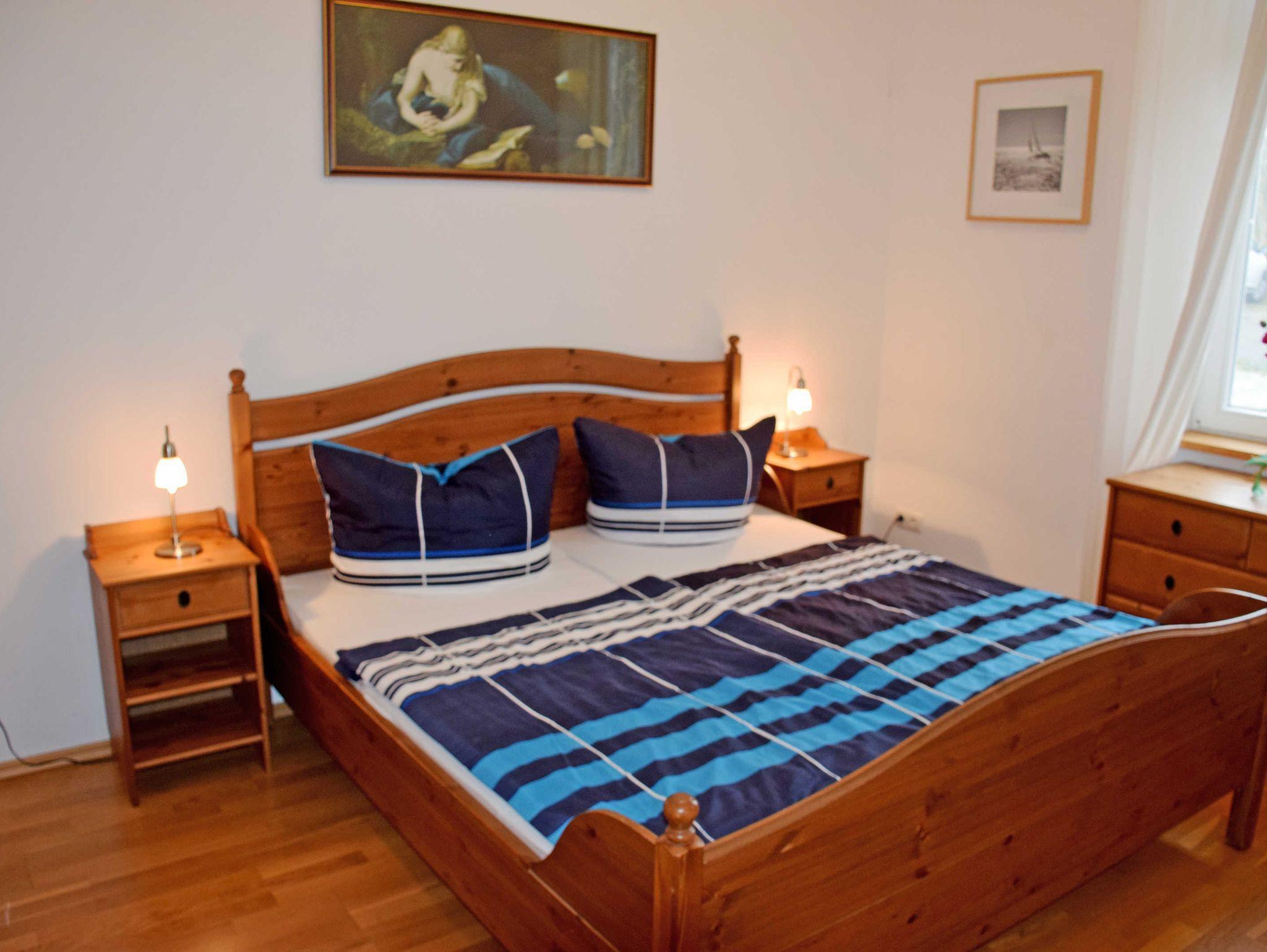 1 Schlafzimmer mit Doppelbett (180 x 200 cm), Nachtischen, großem Kleiderschrank und kleiner Kommode sowie CD-Radio-Anlage.